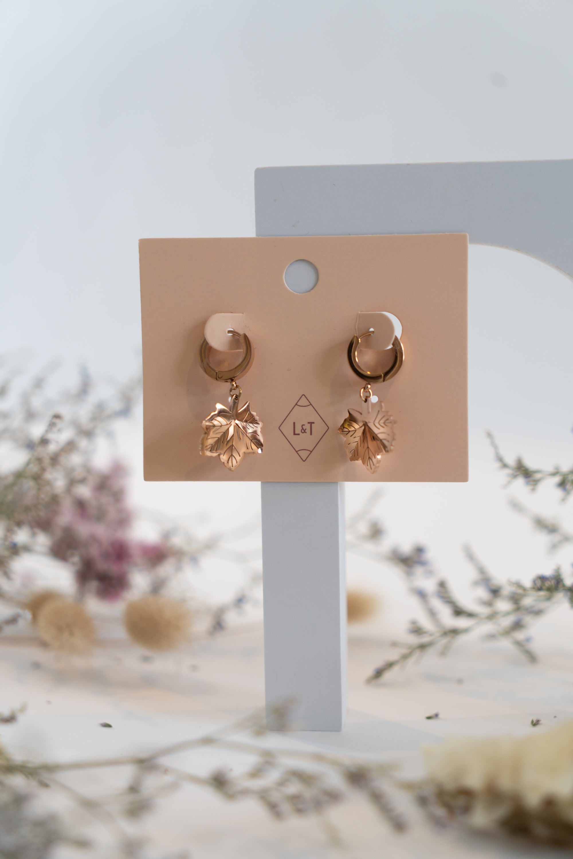 These earrings feature a stainless-steel base plated in rose gold, showcasing delicate maple leaf dangles. Their elegant design makes them perfect for any occasion, adding a touch of nature-inspired charm to your outfit.