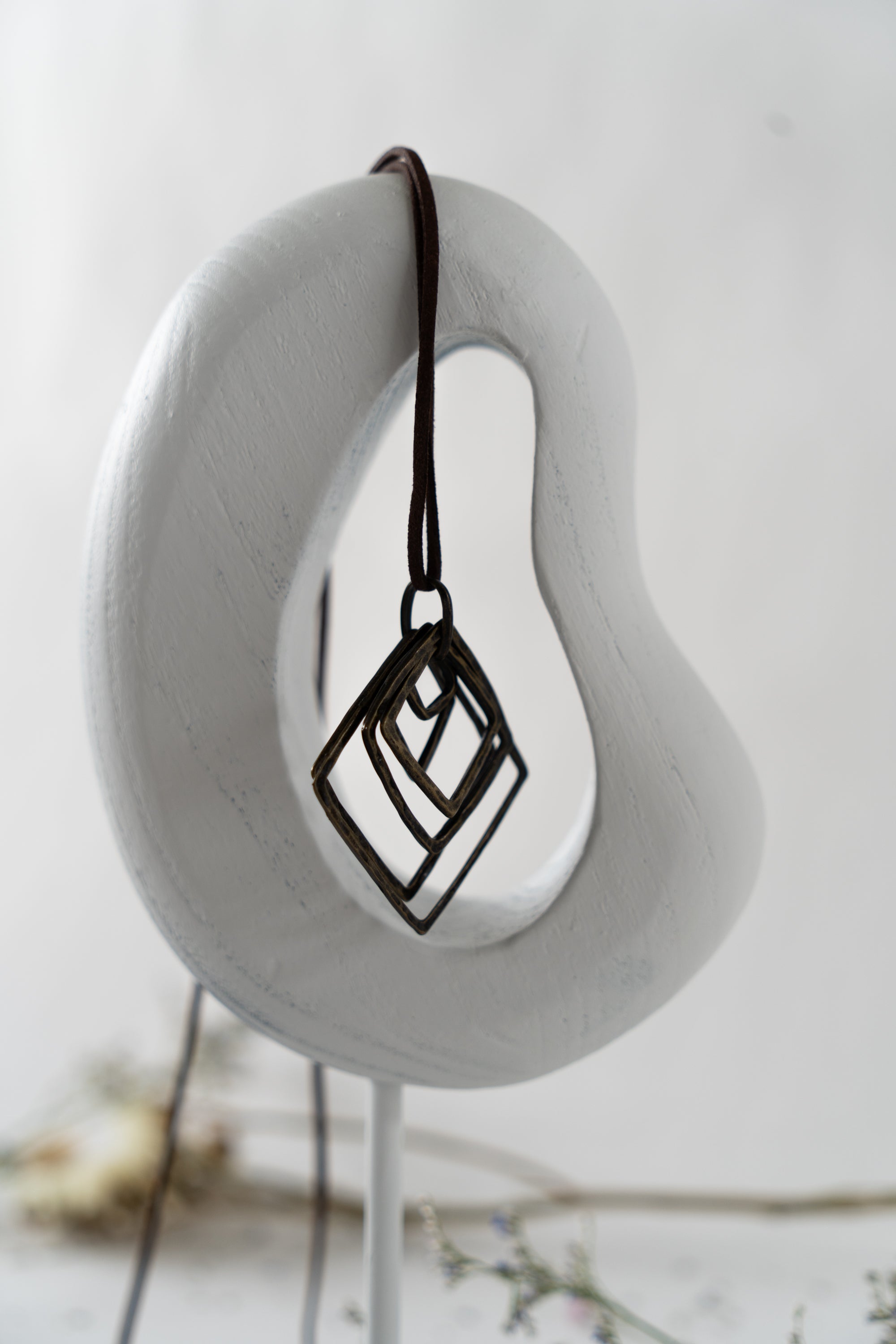 This smaller necklace features six antique bronze rectangles of differing size hanging from an antique bronze hook and hanging from a brown leather cord. Its understated design offers an earthy, elegant look for those seeking a subtle yet stylish accessory. Although not adjustable as such the cord can be re-tied to a shorter length.