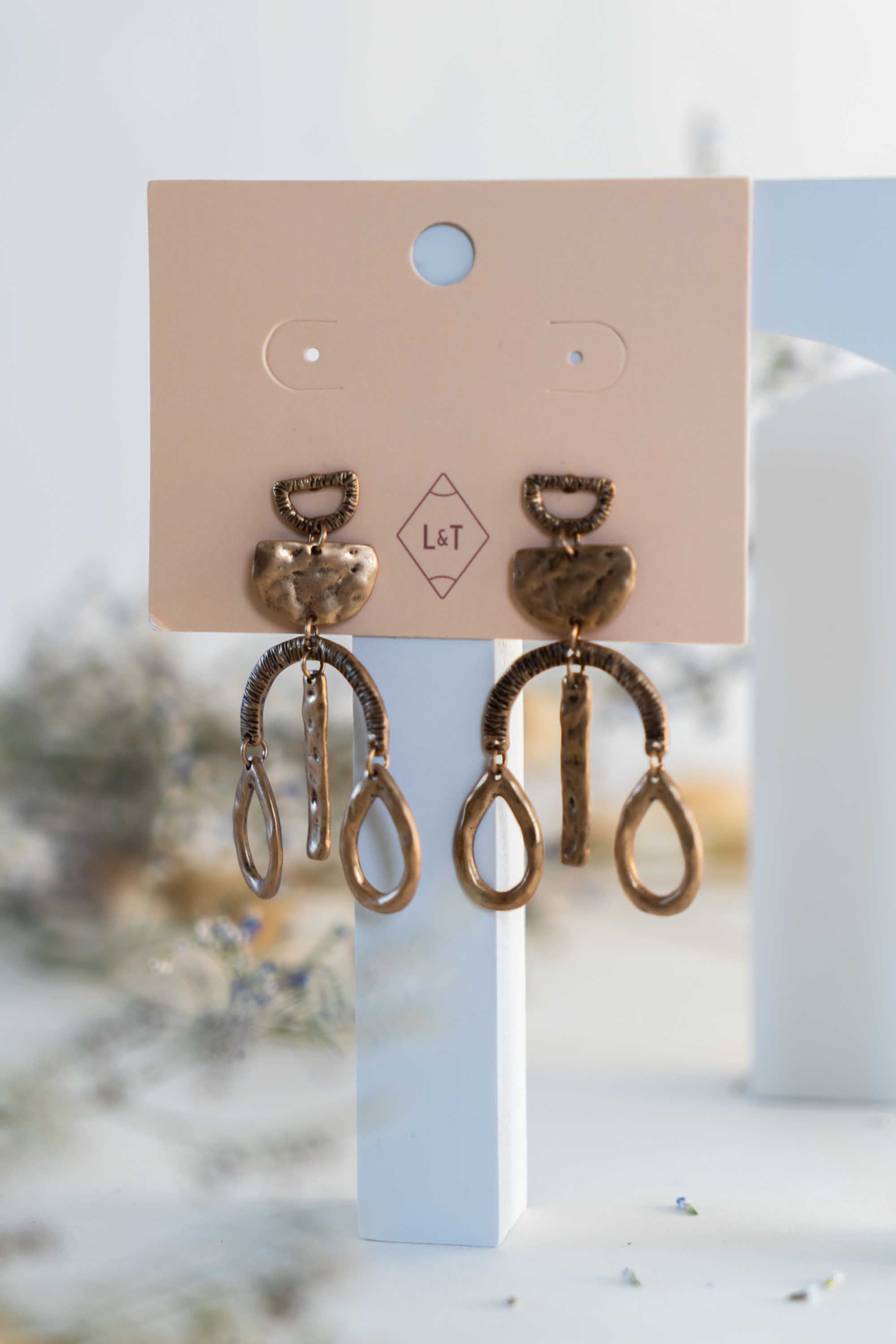 These lovely earrings feature lots of twists, dangles, and beaten metal, giving them a distinct vintage feel. Available in Antique Silver and Gold options, they offer a unique and nostalgic charm.