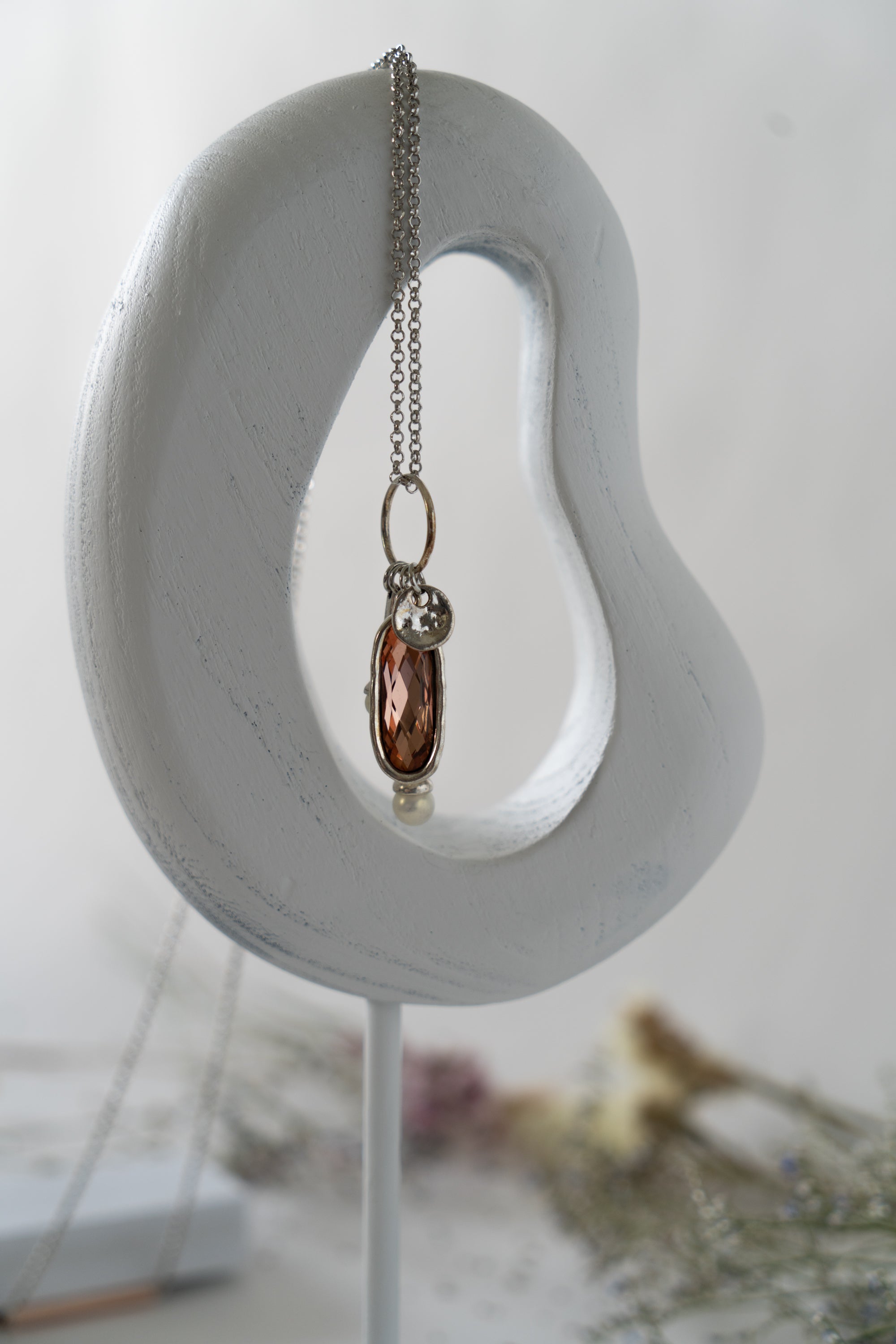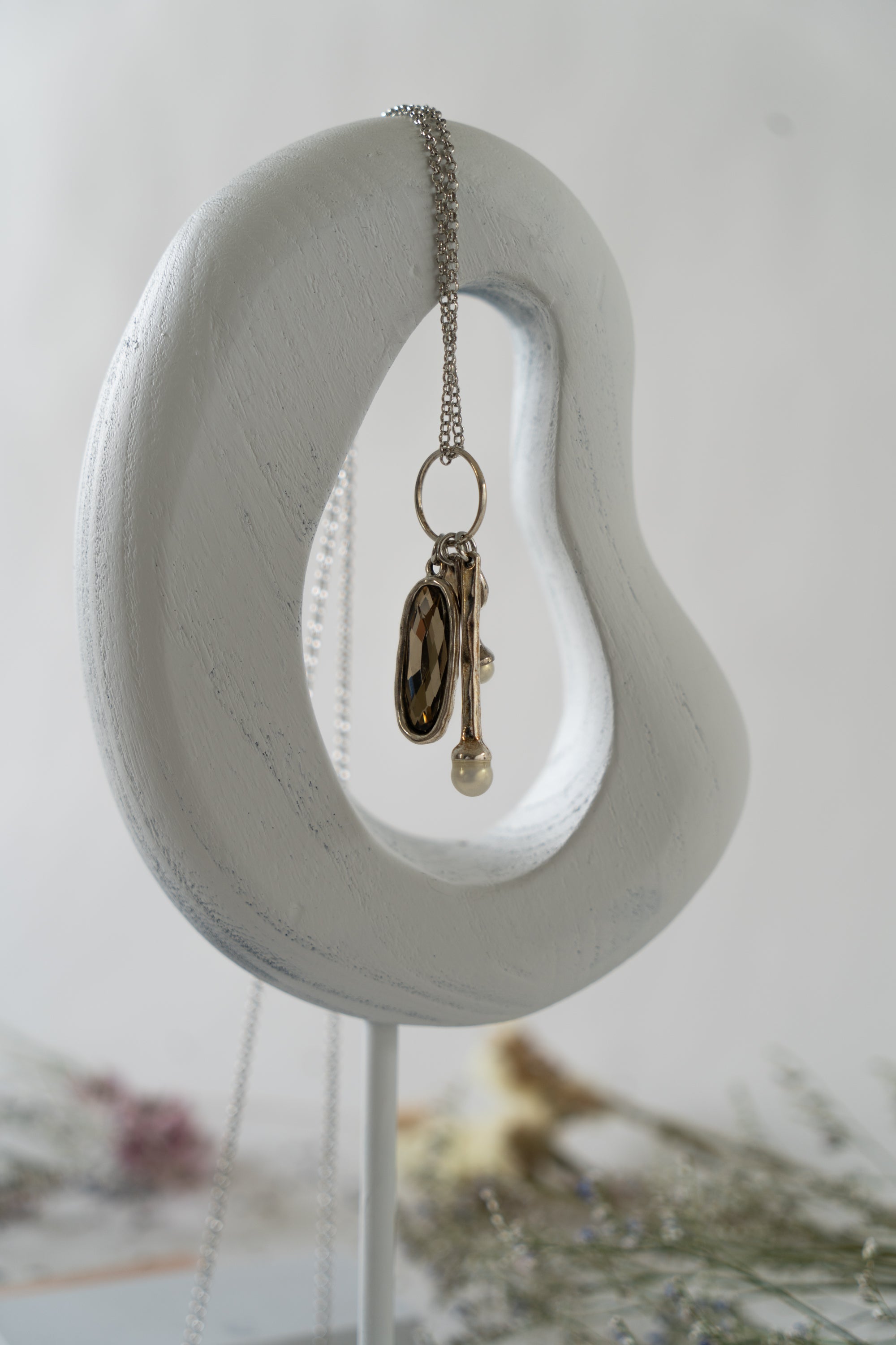 This piece is the epitome of long yet delicate elegance. It features a fine silver chain adorned with a graceful arrangement of attachments, a slender ring from which an elongated crystal, encased in antique silver is suspended. Complementing this centerpiece are a silver disc and two silver bars of varying lengths, each accented with a lustrous pearl at the end. The combination of subtle details and refined design makes this necklace a beautifully understated statement piece.