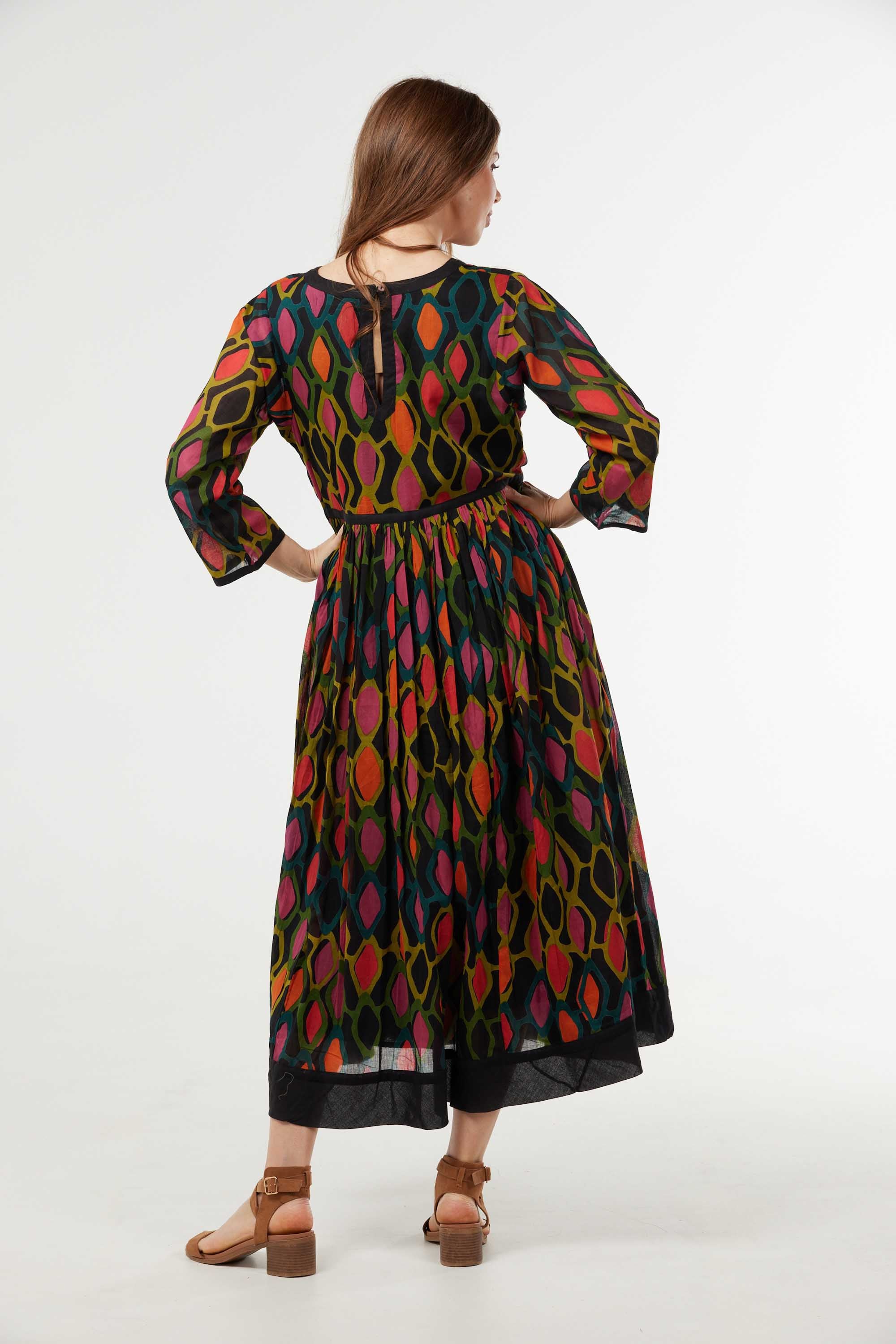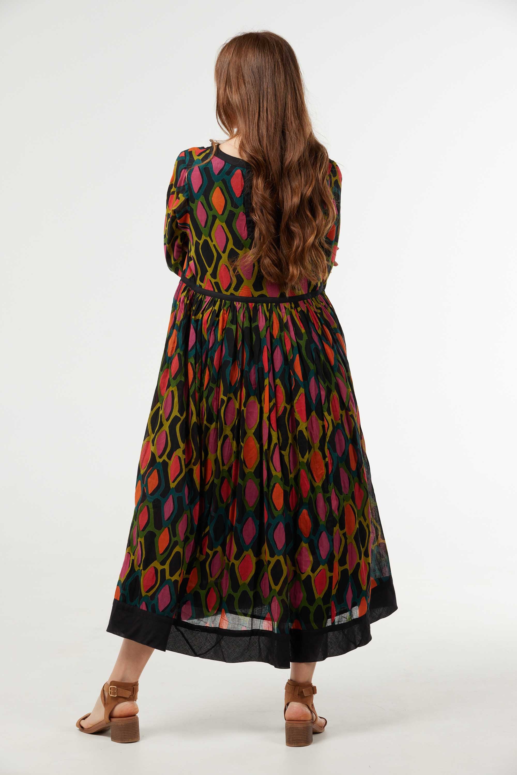 Vibrant hues shimmer like precious jewels, creating a mesmerizing blend of fun and elegance perfect for making a statement on any occasion. This exquisite dress combines playful charm with sophisticated details, featuring a flattering waisted design, a full skirt, and a V neckline accented with a buttoned detail. Black trim adds a refined touch along the neckline, cuffs, and hemline, where a sheer overlay lends an ethereal finish. The front boasts a center panel, while gentle gathers in the back add volume, and convenient pockets make this dress ideal for both casual outings and special occasions.
