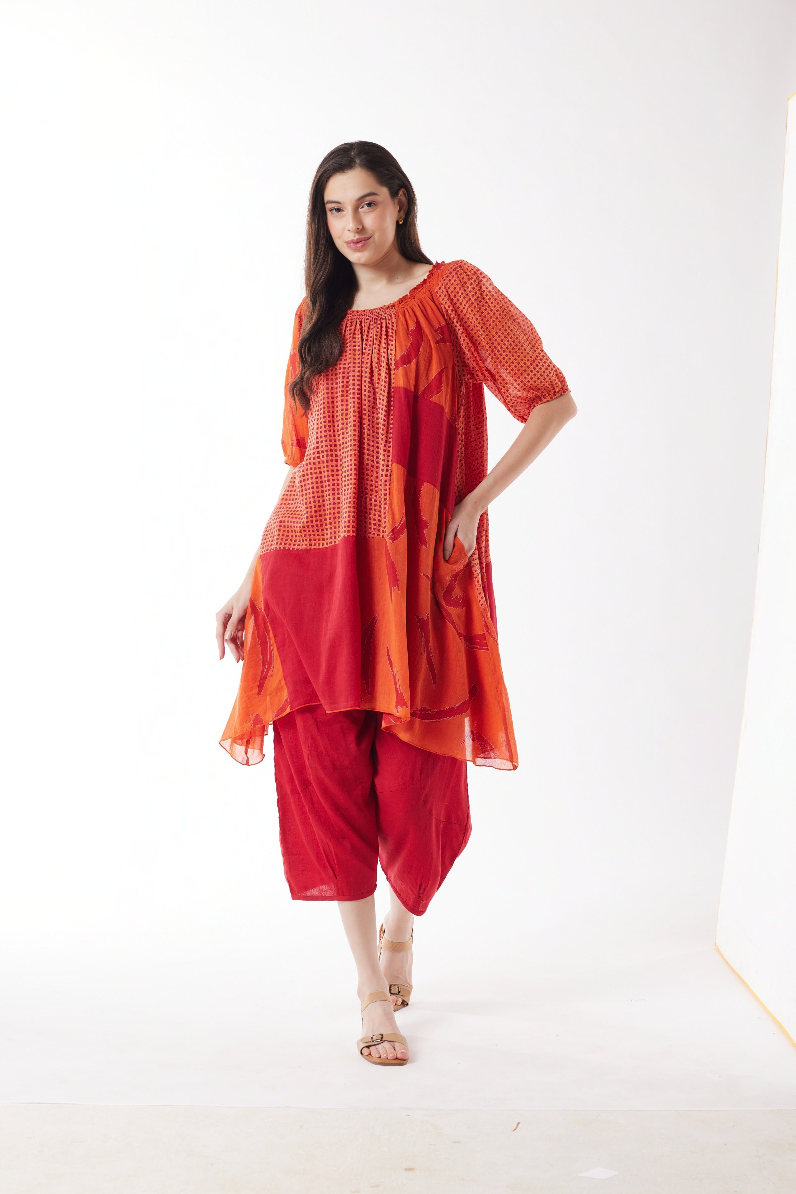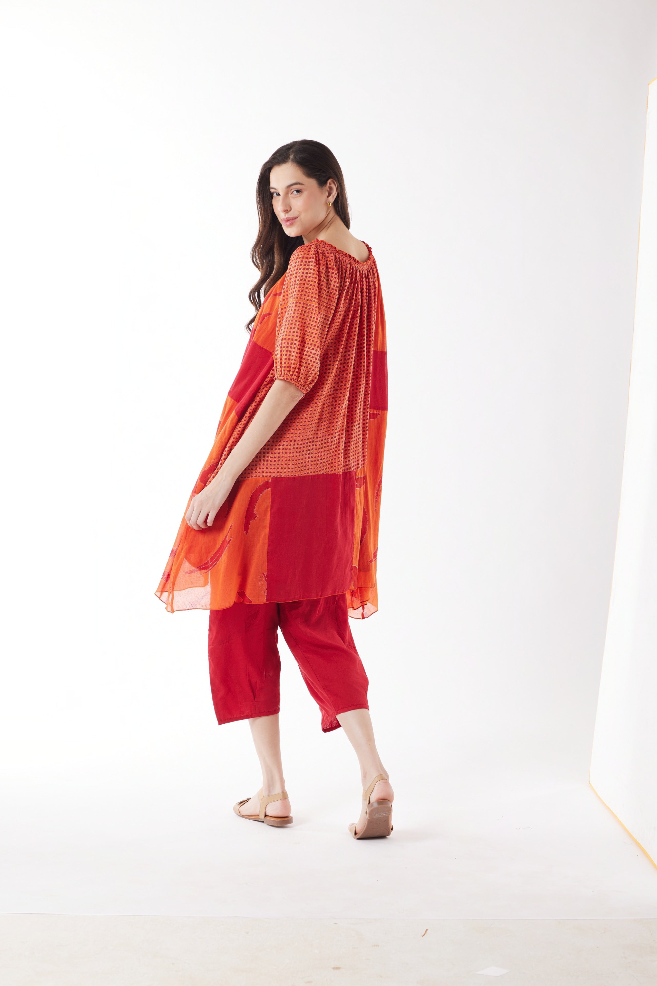 This Au Hasard tunic is a joyful blend of orange tones and textures, combining paintbrush strokes, fine checks, and bold large checks to create a vibrant patchwork-style effect. The elasticised neckline offers versatile styling—wear it comfortably on the shoulder for a soft, rounded look, or off the shoulder for a more relaxed, summery feel. The sleeves are slightly full and finished with a neat binding trim and button at the base, adding gentle structure to the silhouette. Light, expressive, and effortless to wear, this tunic looks especially striking paired with our Au Hasard Cotton Capri Pants in Red.