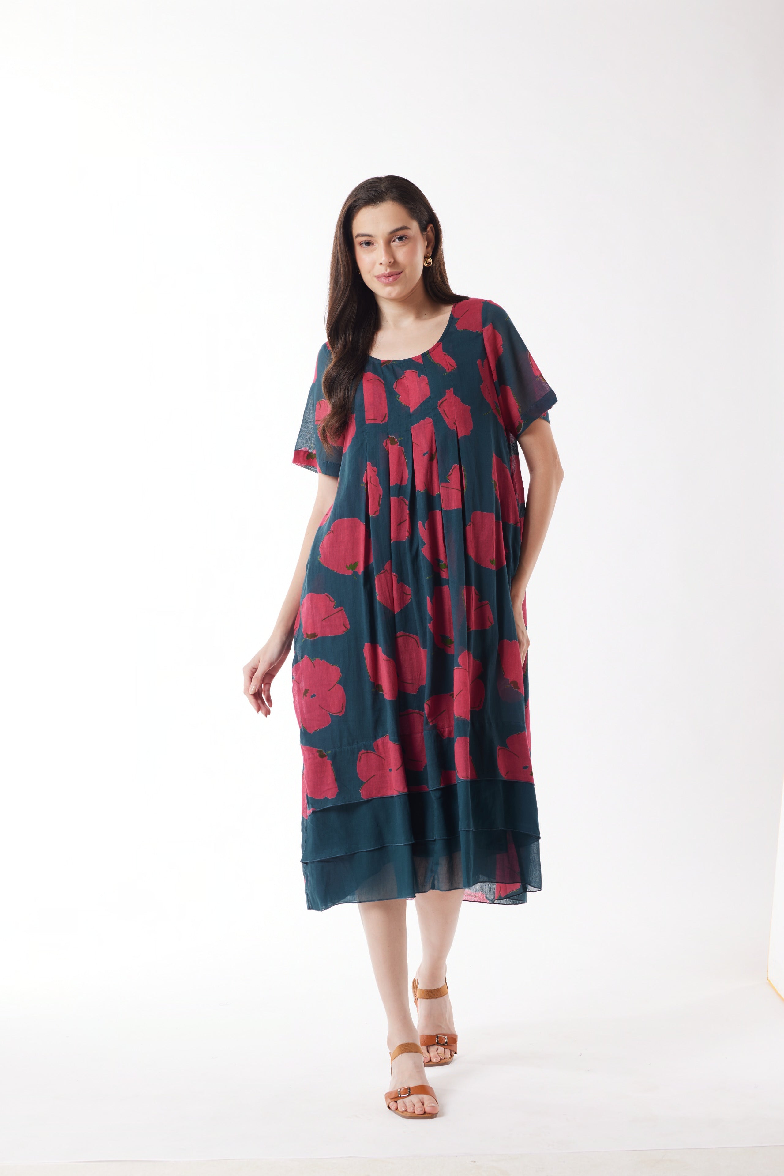Au Hasard D'un Voyage - Navy Poppy Flow Midi Dress