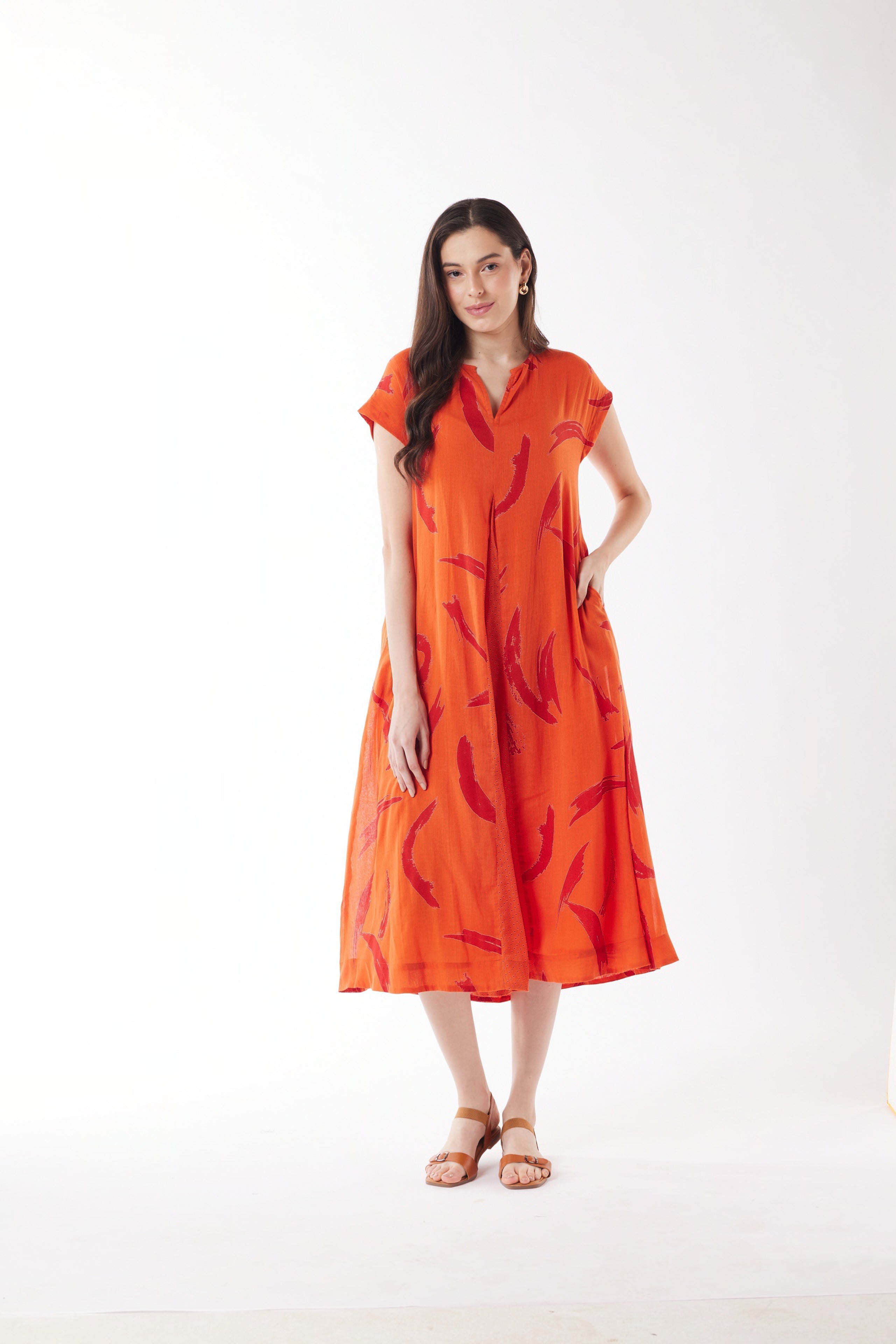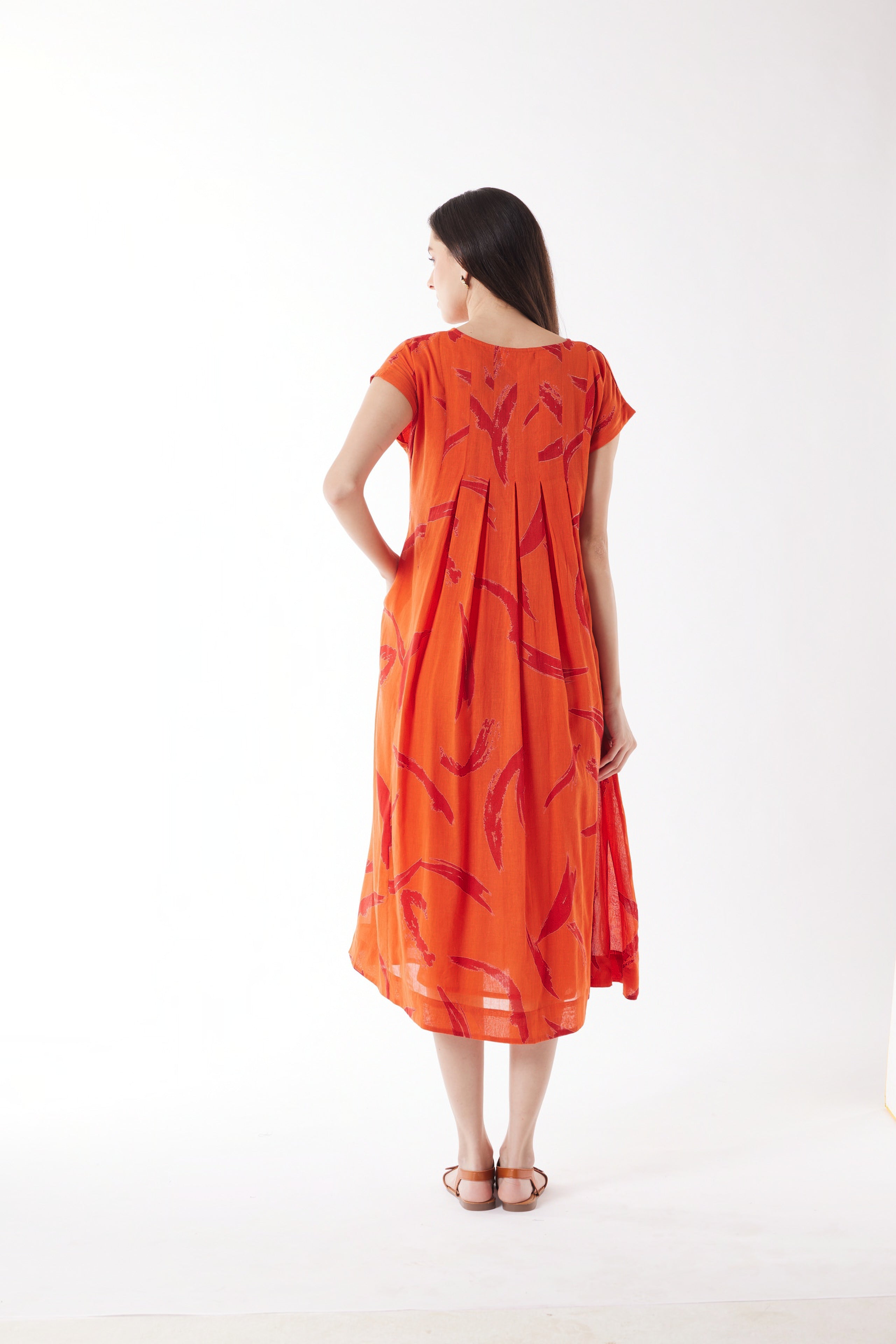 This Au Hasard style shifts into a warm, expressive palette with an orange base washed in darker orange brush-stroke patterns, giving the piece a lively, painterly energy. The central panel echoes the theme with a solid orange ground accented by a single dark-orange spot, creating a bold visual anchor. The split neckline and cap sleeves maintain the style’s clean, modern shape while letting the vibrant print take center stage. A bright, confident piece that blends artistic texture with effortless wearability.