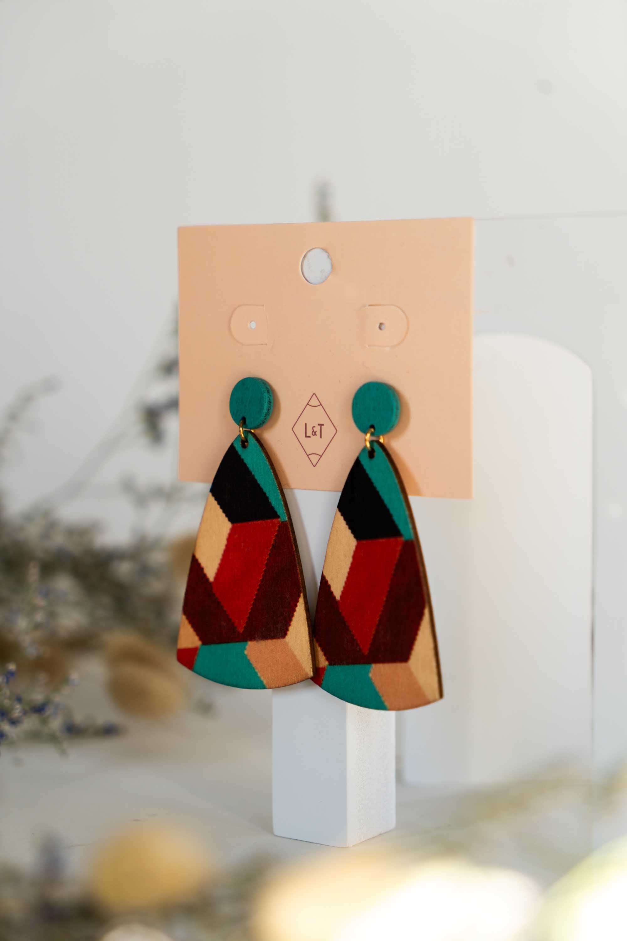 Infuse your look with a pop of color and cultural flair with these lightweight wooden earrings, featuring a striking Aztec-inspired pattern. Crafted on a smooth wood base, they bring a touch of exotic elegance to any outfit, effortlessly combining vibrant style with natural charm. Perfect for adding character to your ensemble, these easy-to-wear earrings are an ideal choice for those who love unique, artful accessories