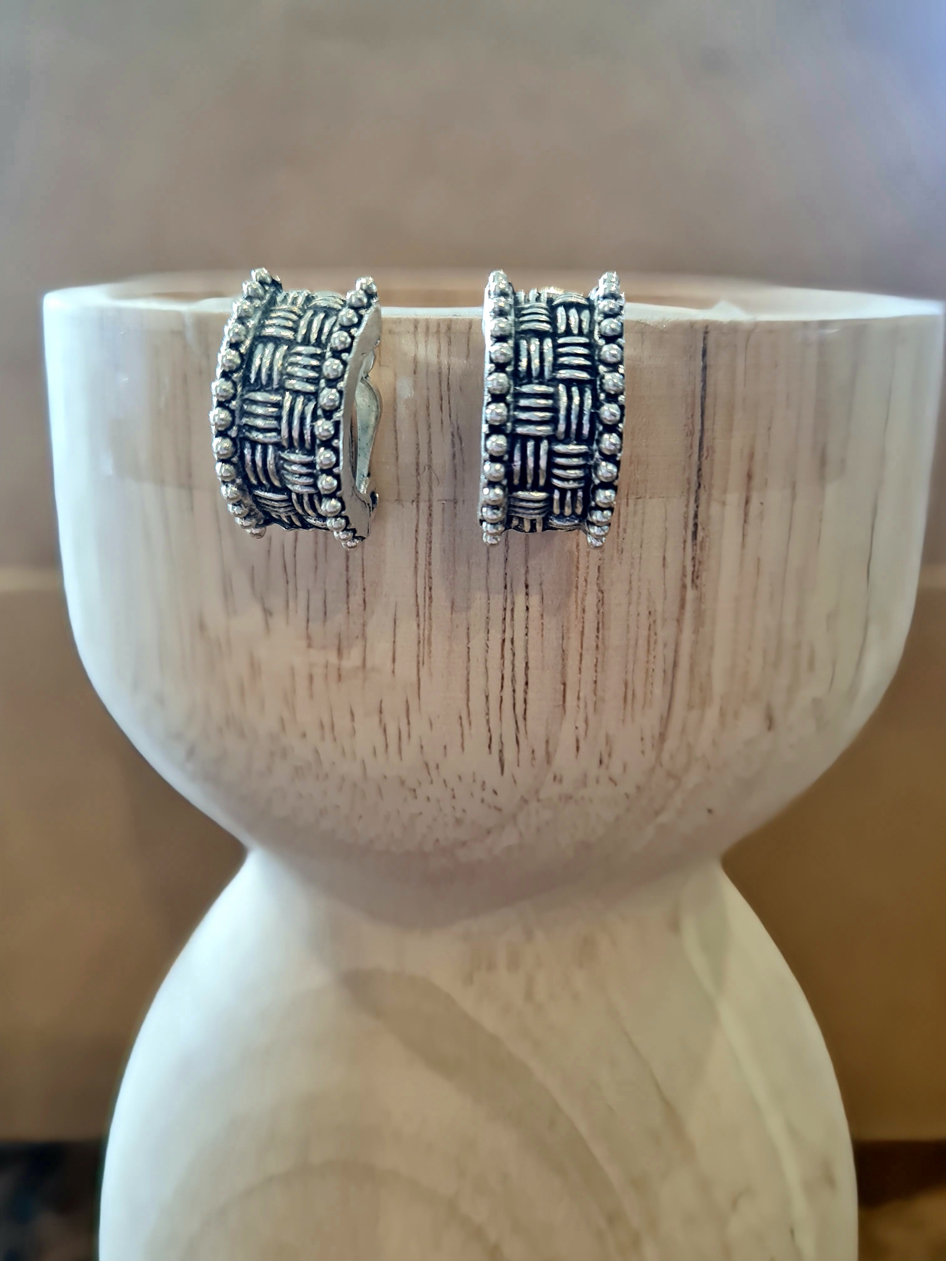 Classic huggie-style clip-on earrings in an antique silver finish, featuring an intricate basketweave pattern. A timeless design with subtle vintage charm.