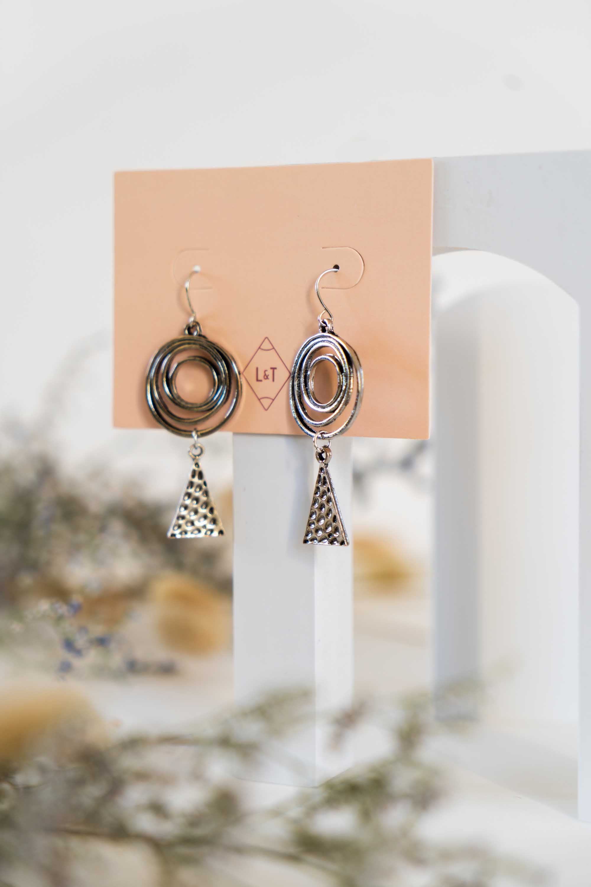 These silver earrings, known as "Beaten Circles," showcase a distinctive design with a rolled-up circular center and a hanging triangle below. The textured, beaten finish of the circles adds an artisanal touch, while the geometric triangle brings a modern edge. This unique combination creates a striking and stylish look, perfect for adding a contemporary flair to any outfit.