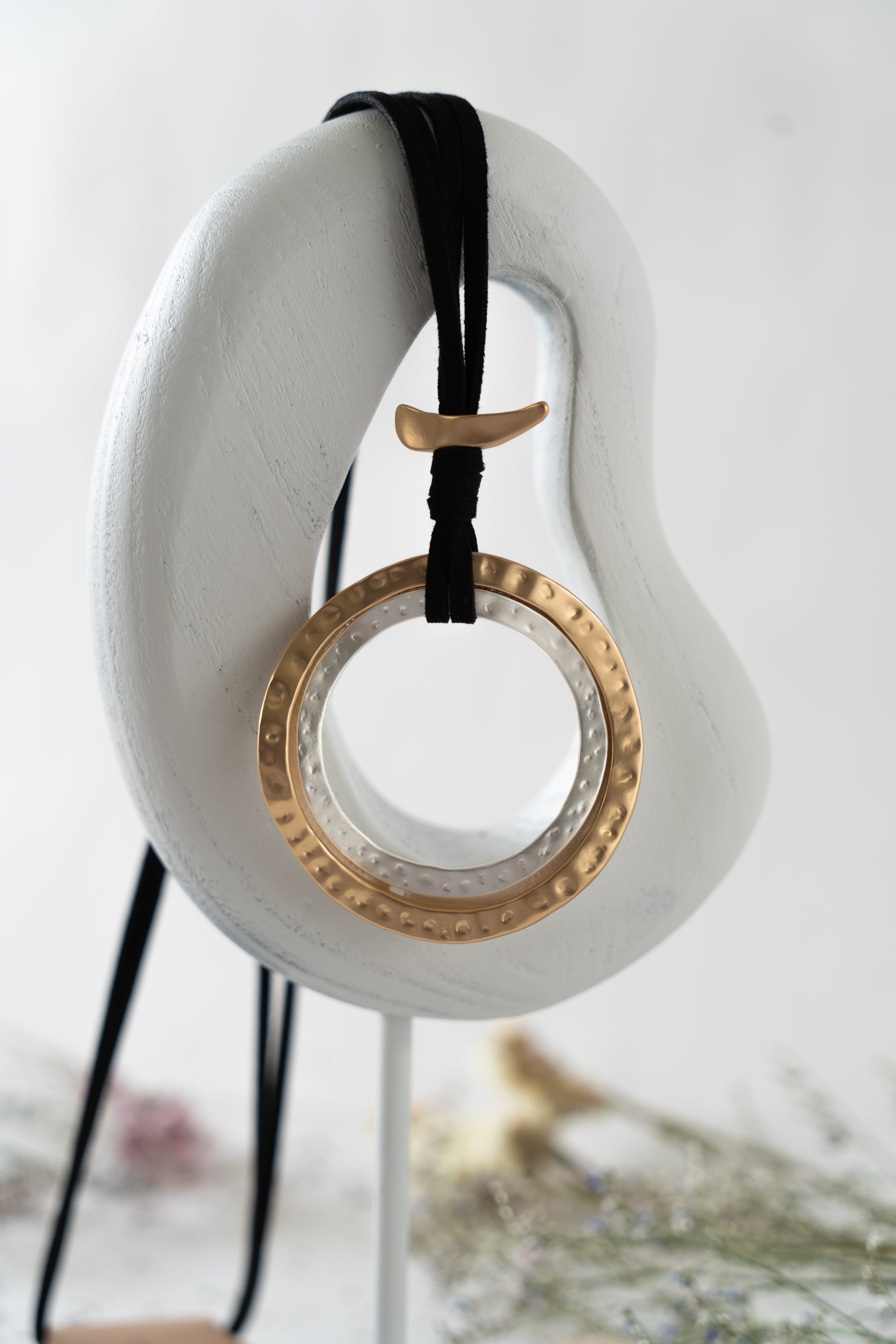 This necklace features a striking matte finish in a mix of gold and silver, with a gold ring elegantly slotting over a beveled silver ring. It is suspended from a double-strung leather thong cord and topped with a matte finish gold bar. This chunky, beautiful piece is adjustable, with an additional 7 cm of length available if needed.