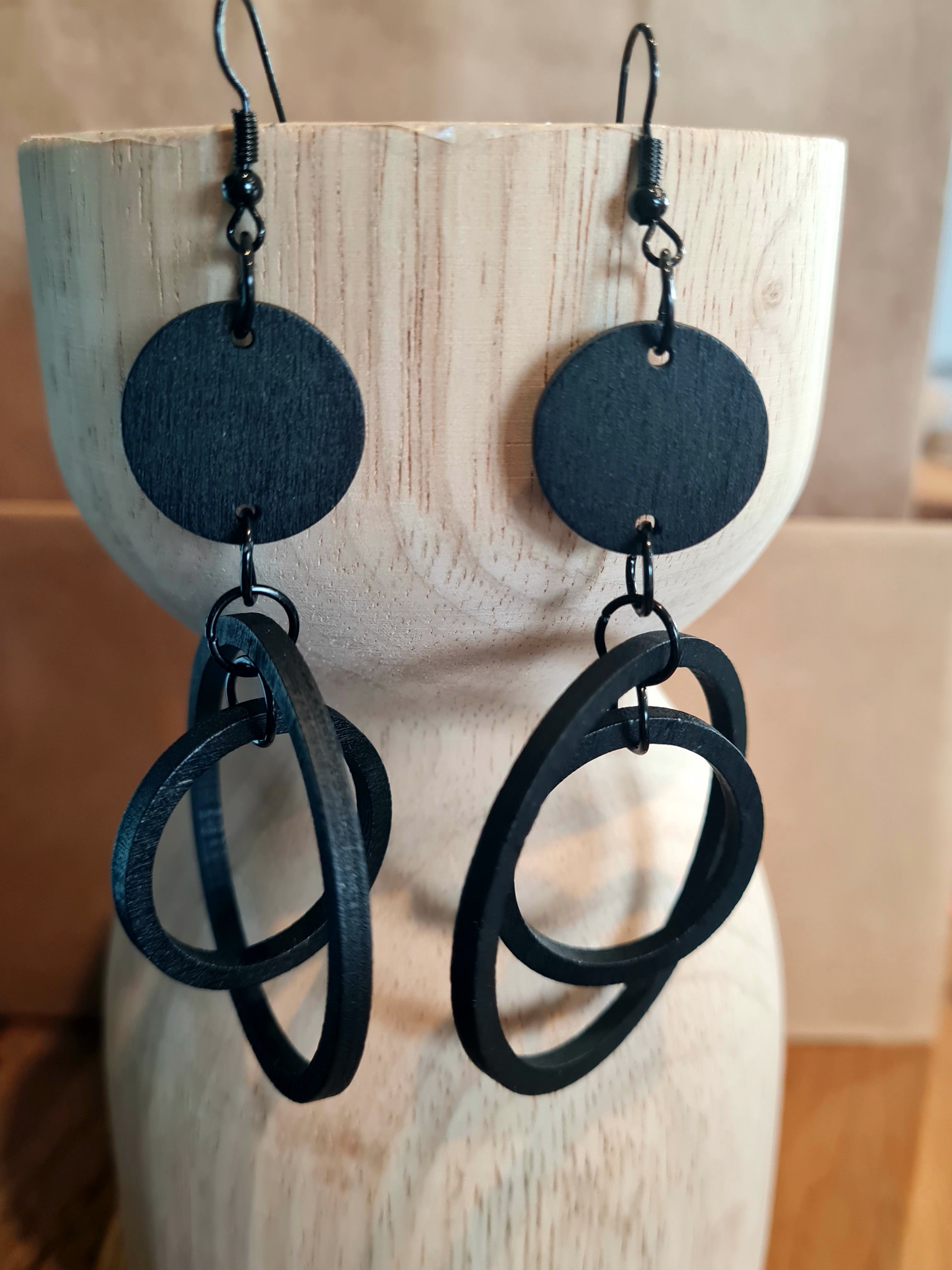 Minimalist yet striking, these lightweight wooden earrings feature two interlocking black rings suspended from a smooth round disc. The modern geometric design adds effortless sophistication, making them a versatile accessory that transitions seamlessly from daywear to evening elegance.