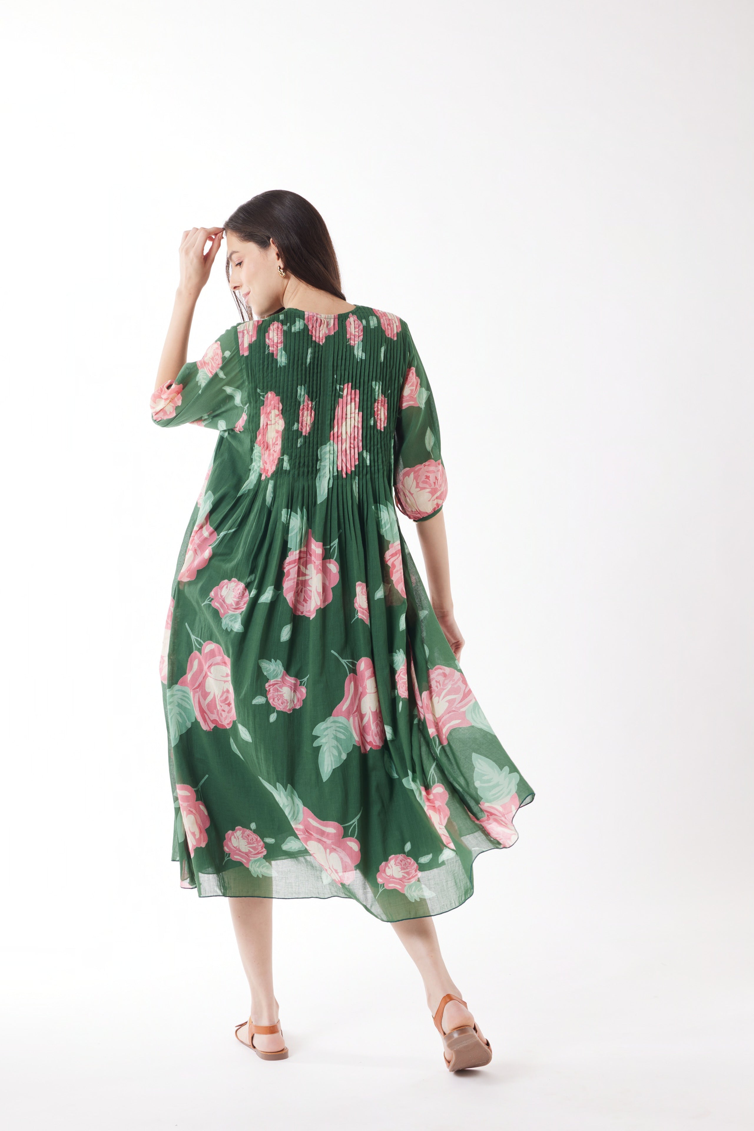 Peony Pintuck Midi Dress — Verdure Green Peony Bloom