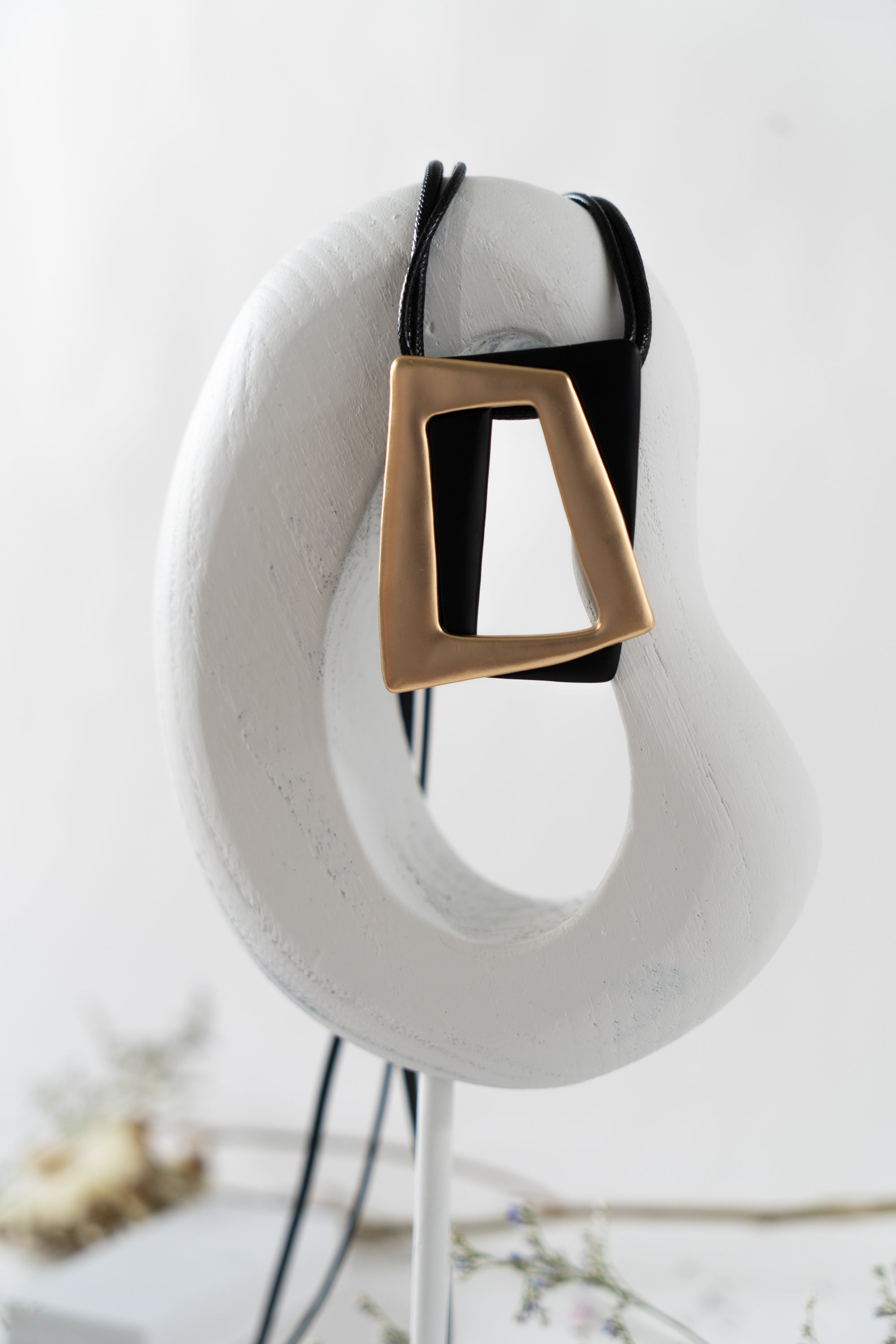This necklace features two offset rectangles - one in black and the other in matte gold - stacked one over the other. It hangs from a double black cord that is adjustable, with the option to extend by an additional 6 cm beyond the listed measurement. This design combines sleek geometry with a modern color contrast, offering a stylish and customizable accessory.