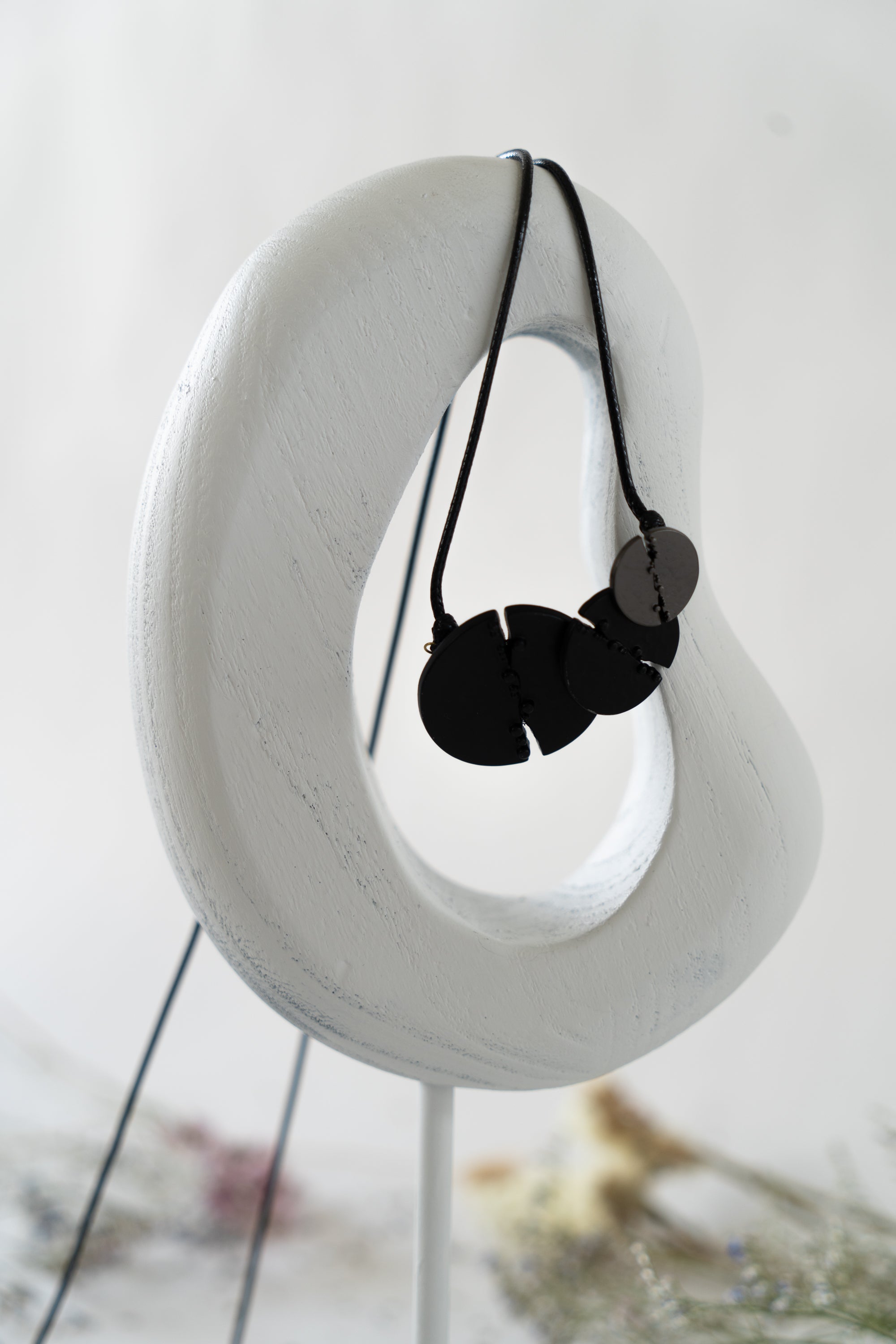 This necklace showcases three matte black discs, each uniquely textured and dotted, including one with a metallic sheen. Arranged in varying sizes and artfully chained together in the background, the minimalist design provides a delicate yet striking appearance. The combination of subtle textures and diverse disc sizes adds depth and sophistication. Simple and elegant, this versatile piece enhances any outfit with its understated charm.
