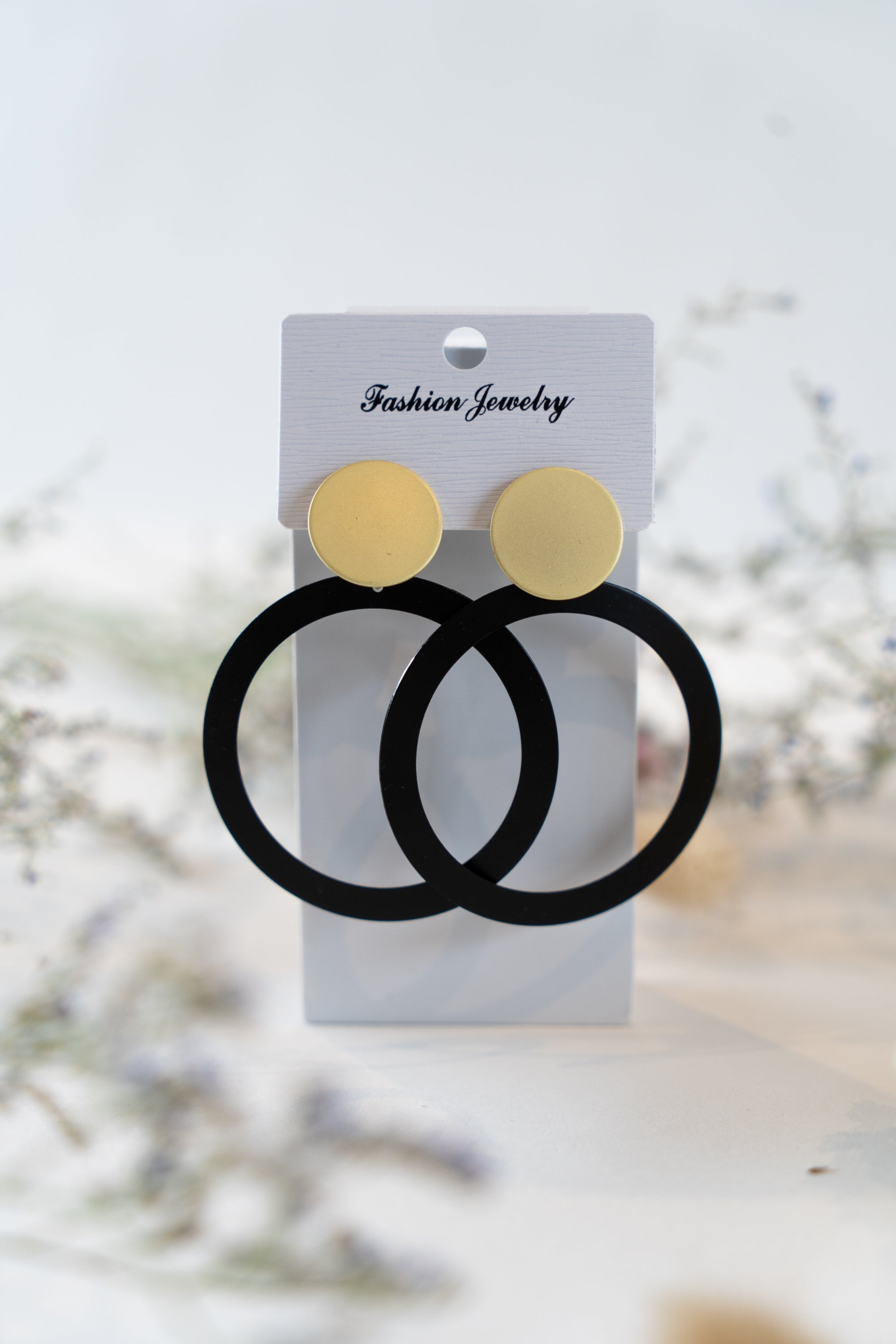 Our diverse range of black earrings includes options for both evening and casual wear. From the casual range, these earrings feature matte black metal fine rings with button matte gold tops. Their versatile design allows them to be dressed up or down, making them suitable for any occasion.