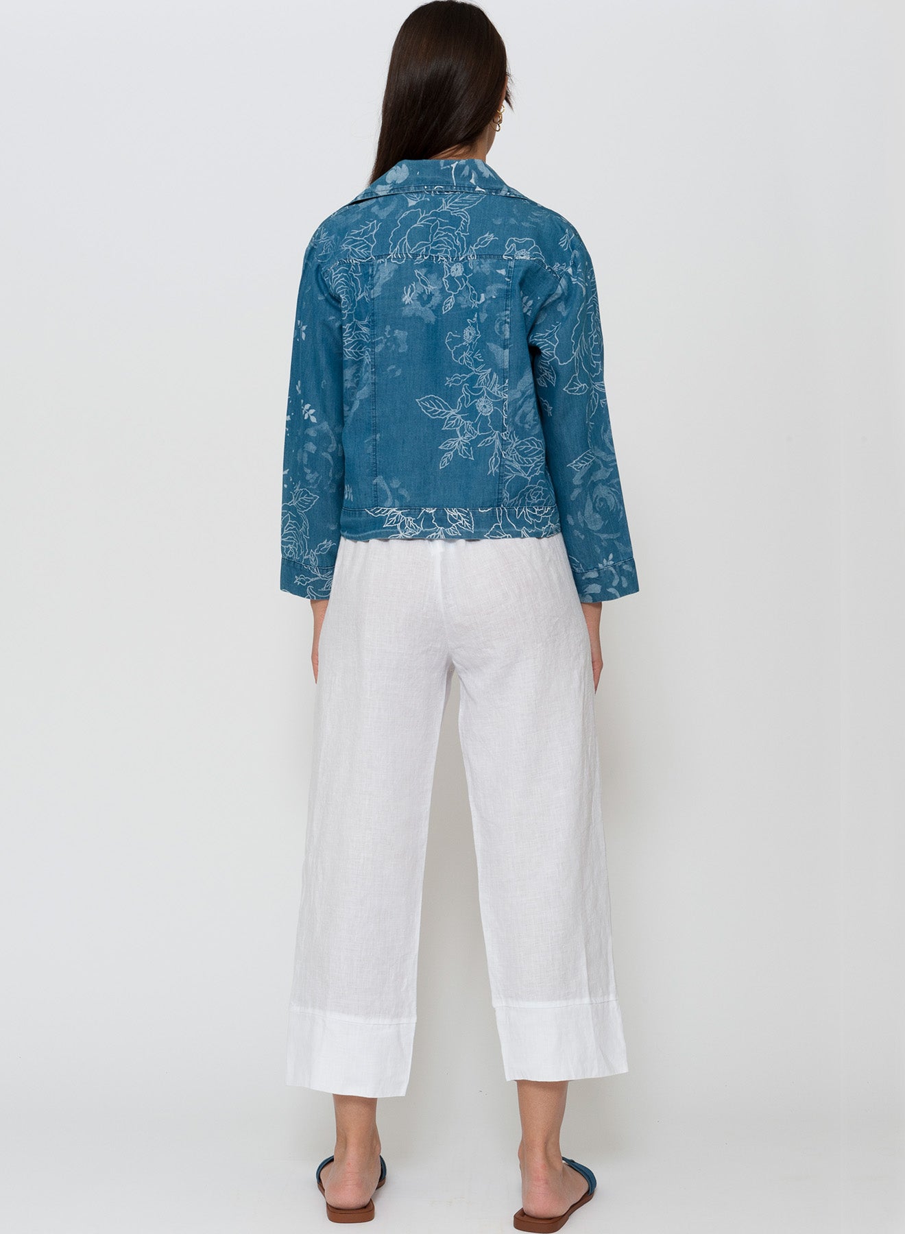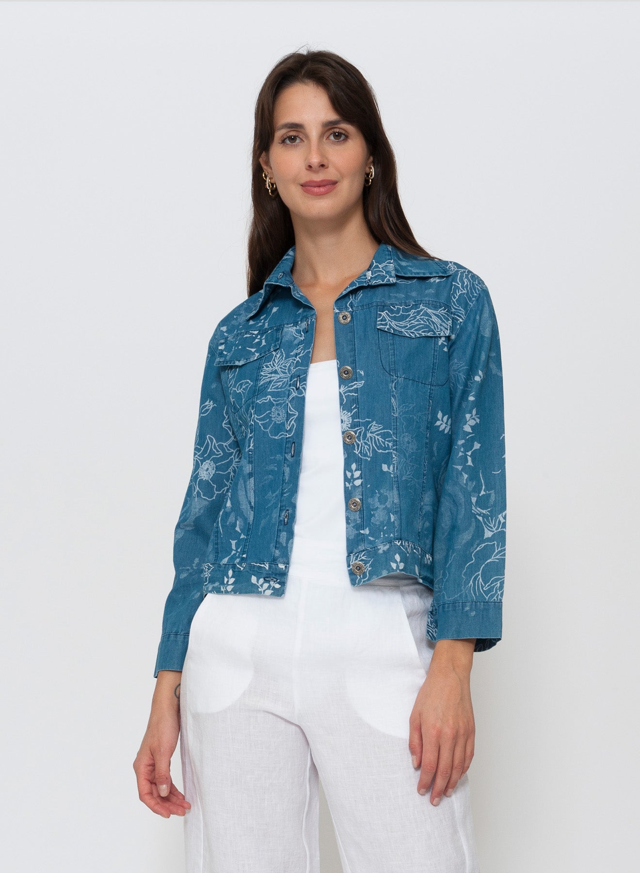 Elevate everyday dressing with this softly structured bomber-style jacket, crafted from a breathable 65% cotton / 35% lyocell blend in a lighter shade denim floral. Thoughtfully cut with front panels that create a subtle tailored line, it balances relaxed ease with polished femininity. Front tab pockets at the chest add utility-chic detailing, while long sleeves with adjustable tabs bring a considered, versatile finish. Metal buttons throughout lend a refined touch of shine. A lightweight, naturally soft layer that pairs effortlessly with denim, neutrals, or linen for a casual yet sophisticated day.