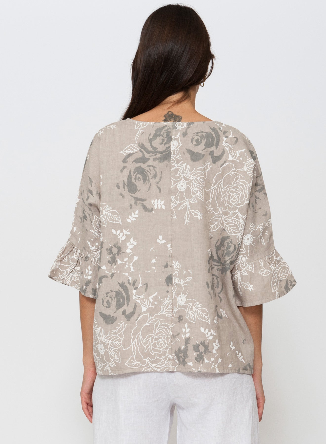 Crafted in Italy from pure 100% linen, this floral top brings effortless femininity to warm-season dressing. Designed with a soft round neckline and flattering batwing style ¾ sleeves finished with a deep frill, it offers a touch of romantic movement with every step. The silhouette is gently A-line and subtly shorter through the front, creating an easy, contemporary shape that pairs beautifully with relaxed or tailored linen.