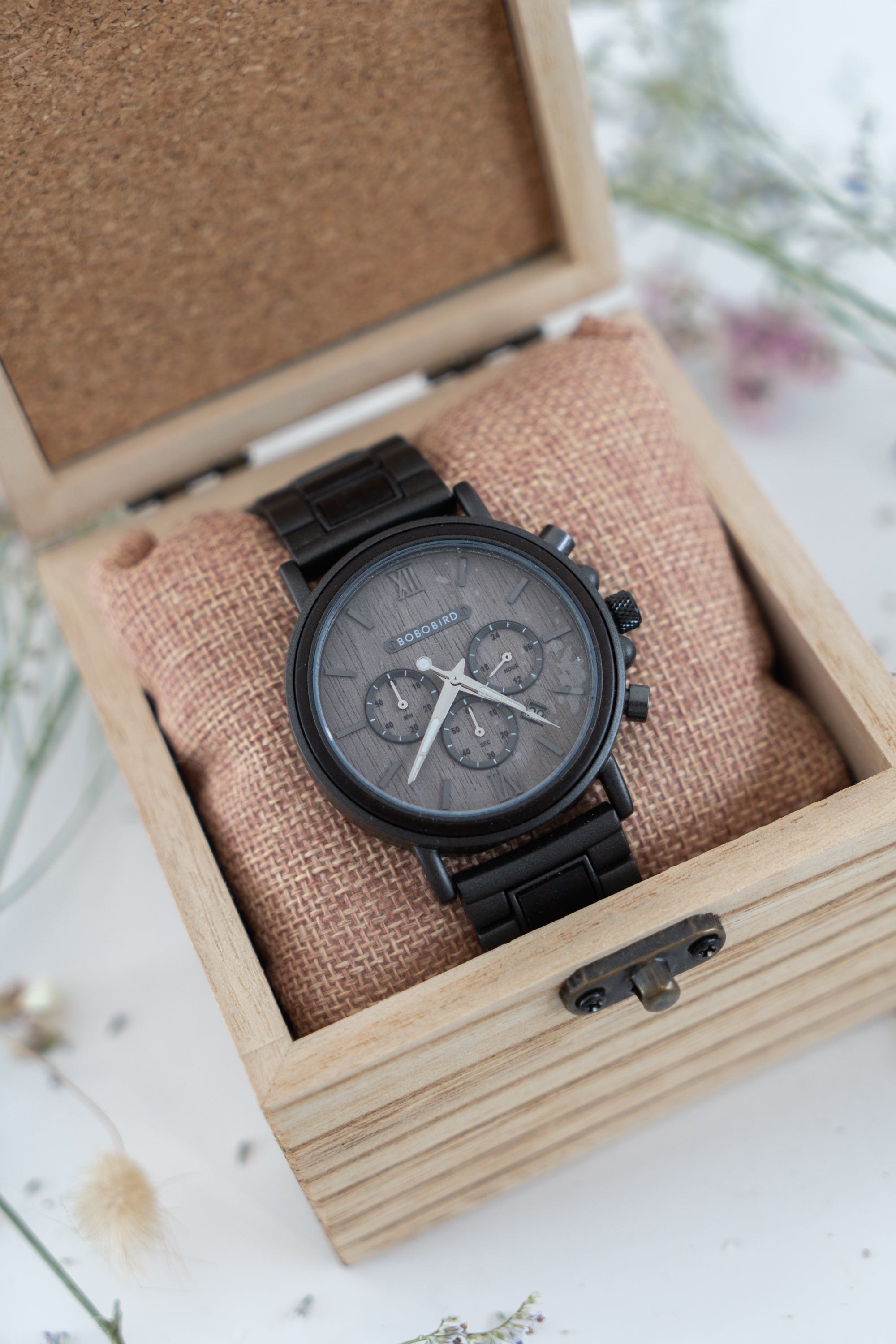 Dark Grey Metal Strap and Face with Grey Woodgrain Centre
