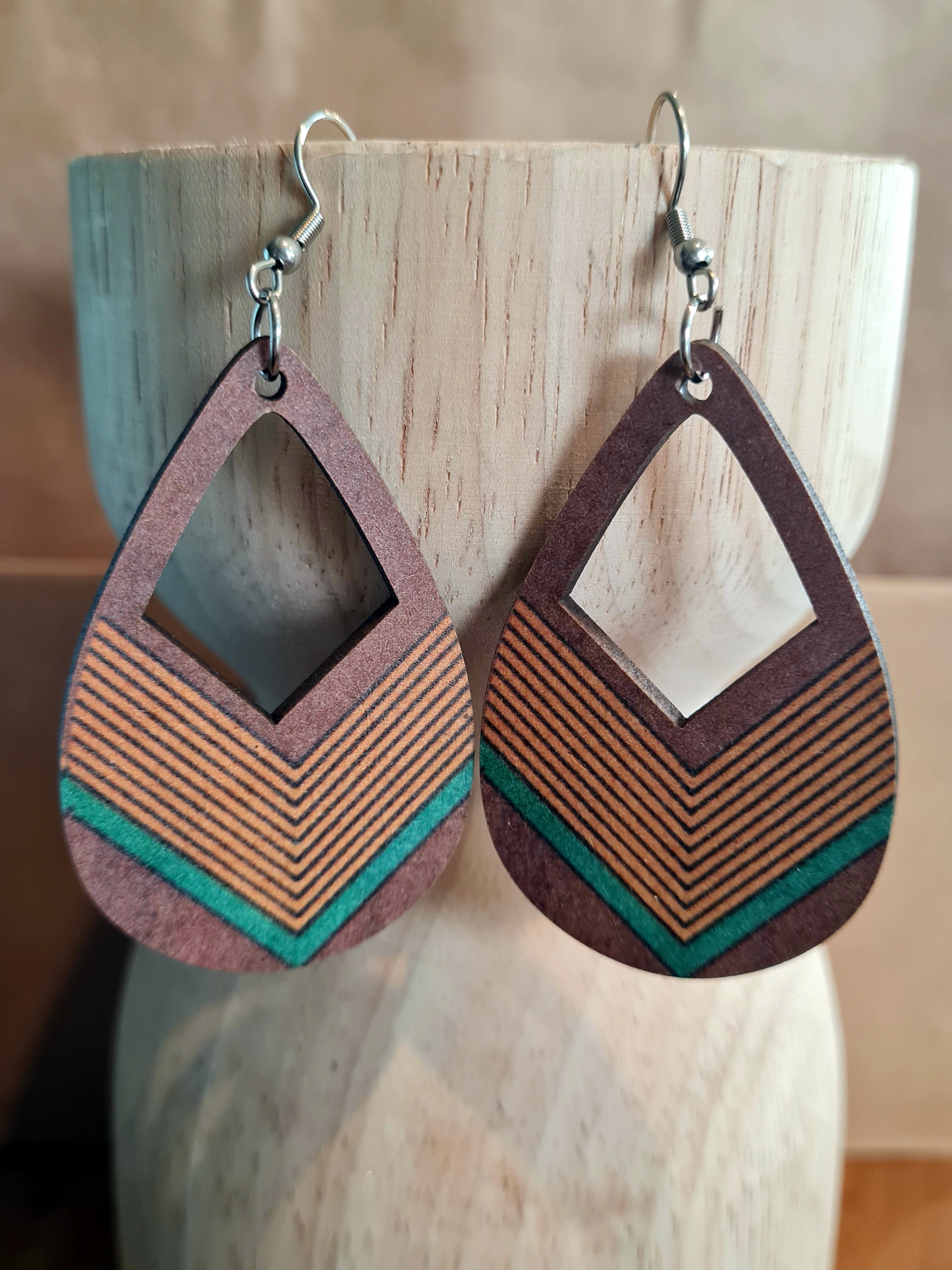 Handcrafted from lightweight wood, these boho-inspired earrings bring a touch of earthy charm to any outfit. Featuring a bold V-pattern in mustard and green stripes, they strike the perfect balance between natural elegance and vibrant style. Designed for all-day comfort, they’re an effortless accessory for both casual and chic looks.