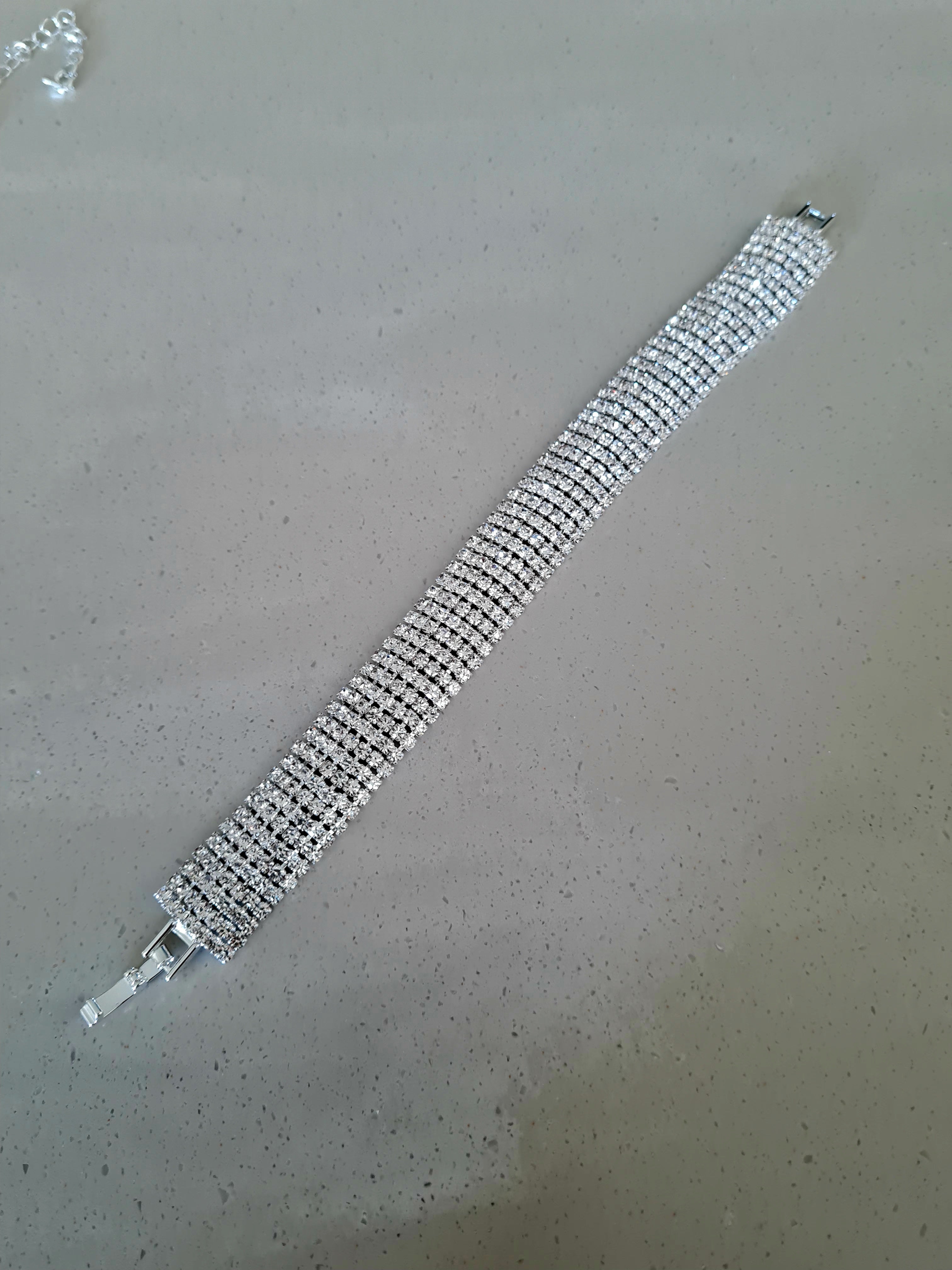 Make a bold statement on your special day with this dazzling crystal bracelet. Featuring seven rows of closely set, high-shine crystals, it delivers an unforgettable display of brilliance and glamour. The layered design wraps the wrist in radiant sparkle, making it the perfect accessory for brides who want a touch of drama and elegance. Whether paired with a classic gown or a modern silhouette, this bracelet adds the perfect finishing touch to your wedding day look.