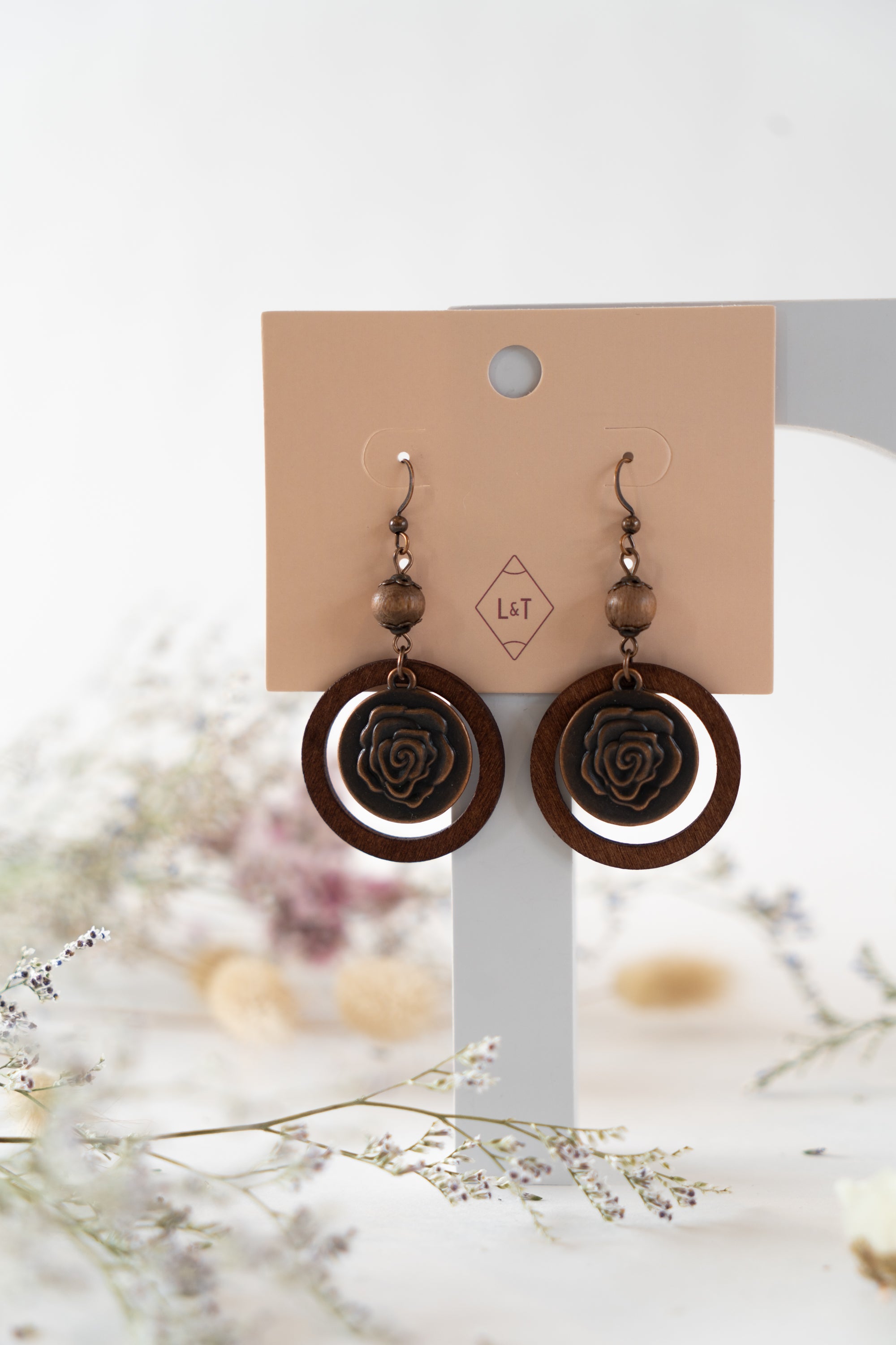 These pretty bohemian-style earrings feature wooden rings adorned with bronze discs engraved with an intricate rose pattern. At the top, wooden beads add a touch of natural charm, creating a harmonious blend of earthy elements and delicate detailing.