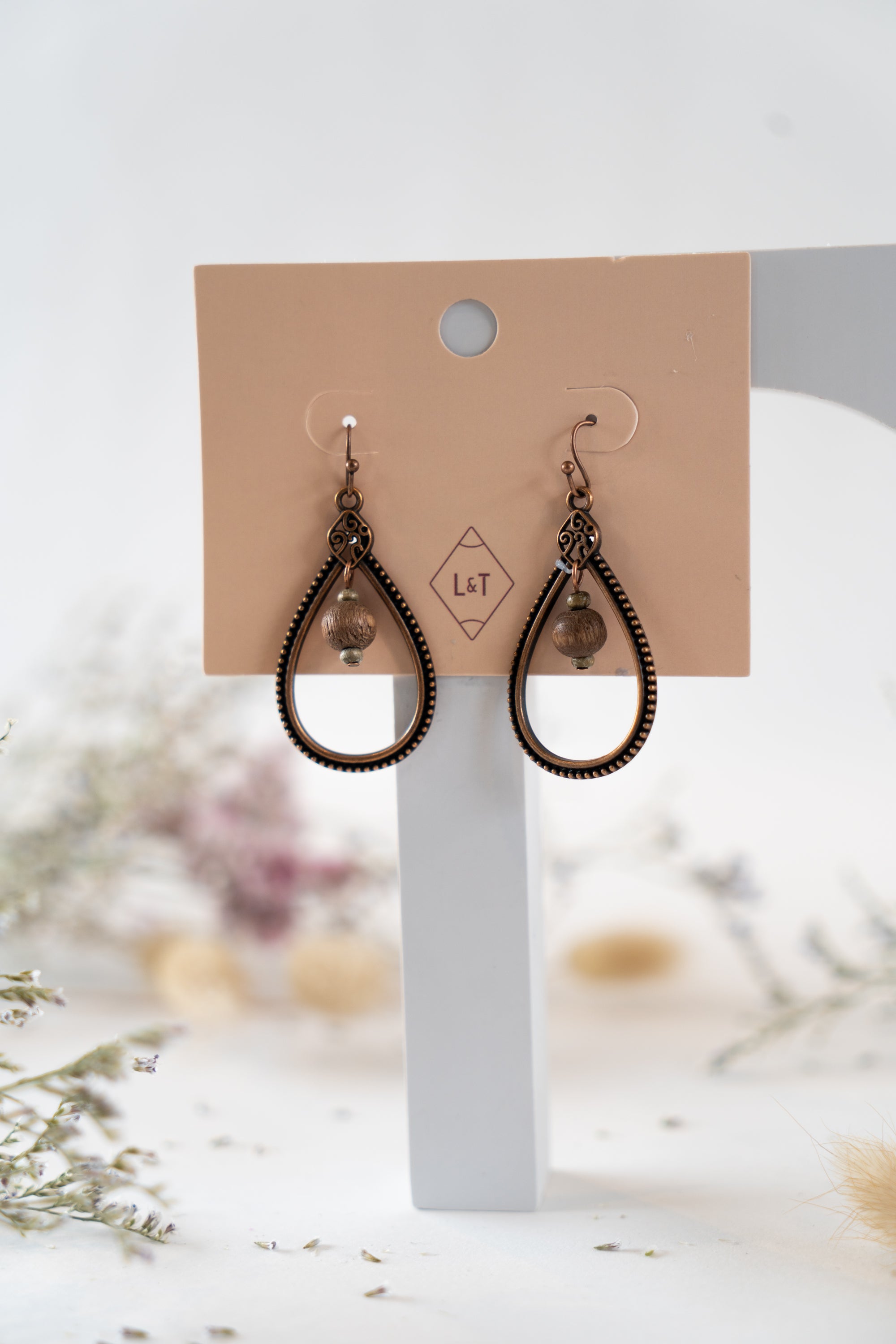 These bronze droplet earrings feature small wooden beads at their center, creating a beautiful contrast between the metallic shine and natural wood. With their earthy, minimalist design, they're a versatile accessory that adds a subtle touch of elegance to any outfit.