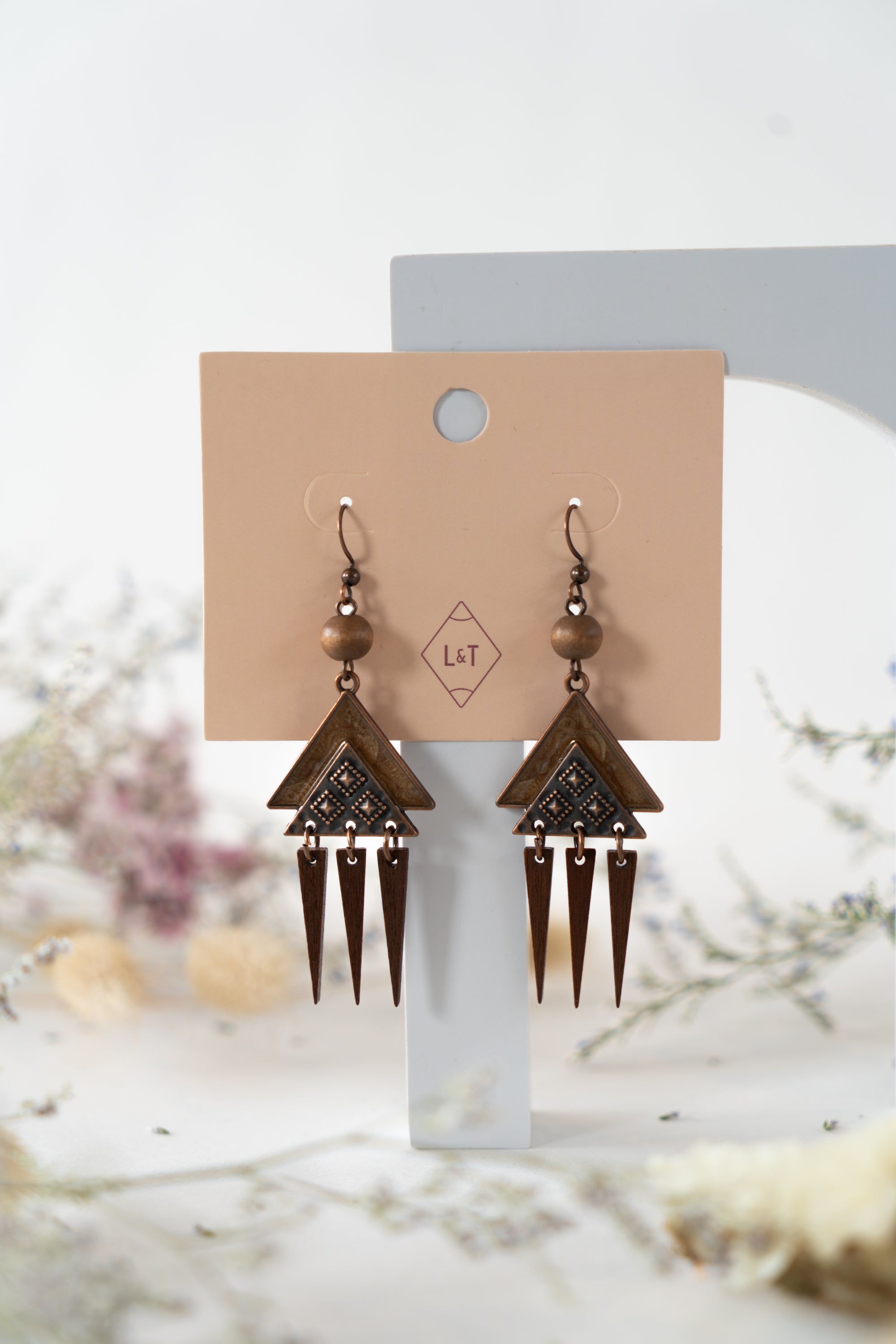 Embrace a bohemian vibe with these earthy earrings featuring bronze triangles adorned with stamped patterns and wooden spikes hanging below. The combination of metal and natural wood elements creates a unique and stylish accessory that adds a touch of rustic charm to any outfit.