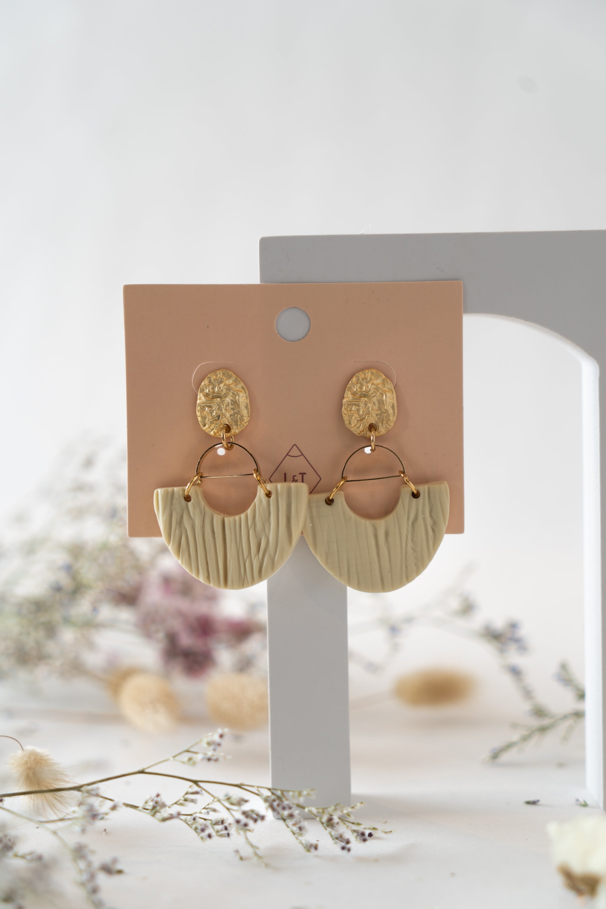 These earrings feature a distinctive design combining the rustic charm of clay and the elegance of gold. The base of the earrings is shaped like a basket, crafted from clay into graceful half circles. Above the clay half circles, there are softly beaten gold-colored tops that add a touch of sophistication and contrast. The design is completed with a sleek ring and bar mechanism that securely holds the half circles, creating a harmonious blend of natural texture and metallic sheen. Perfect for adding an artistic and refined touch to any outfit.