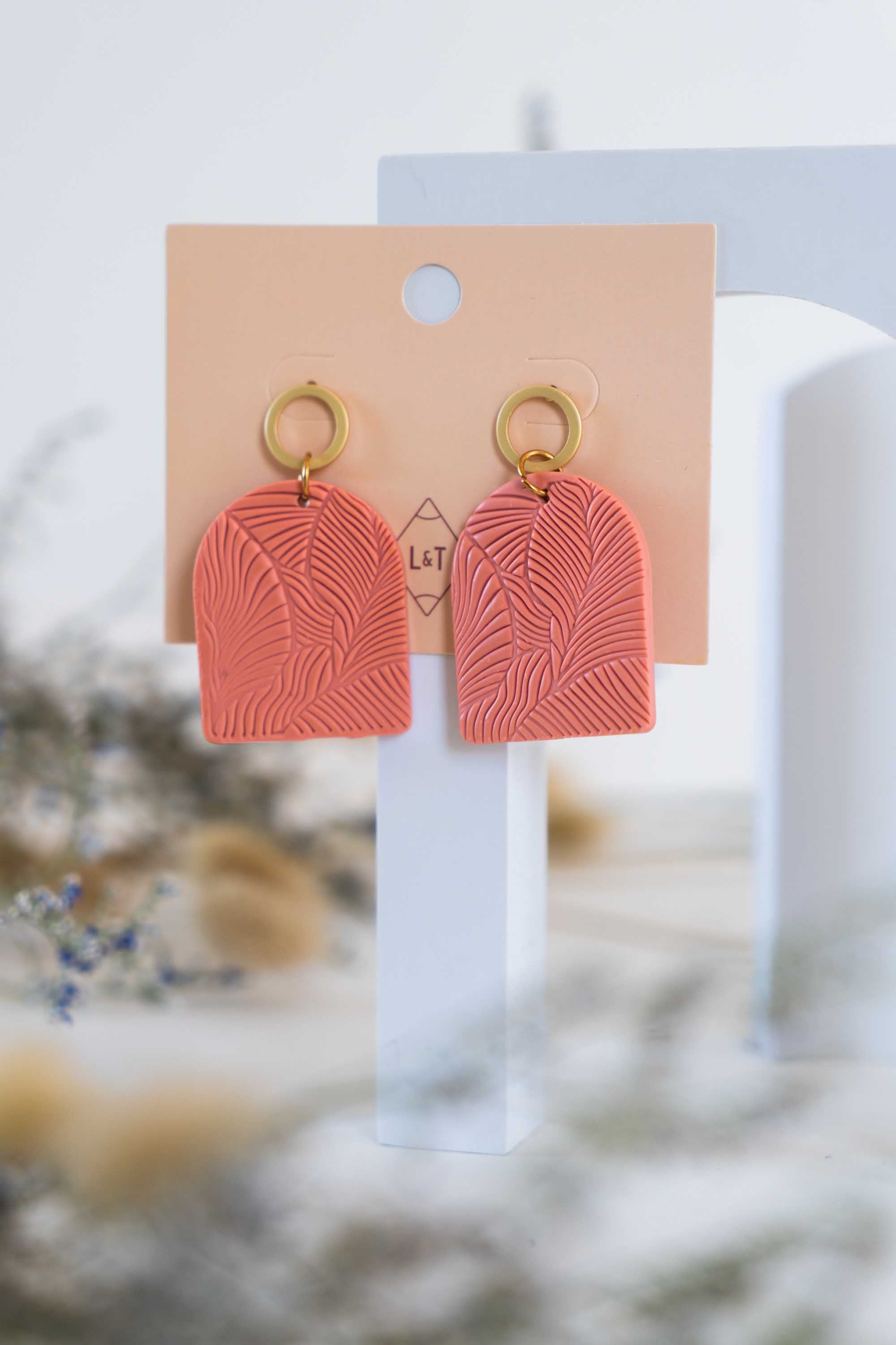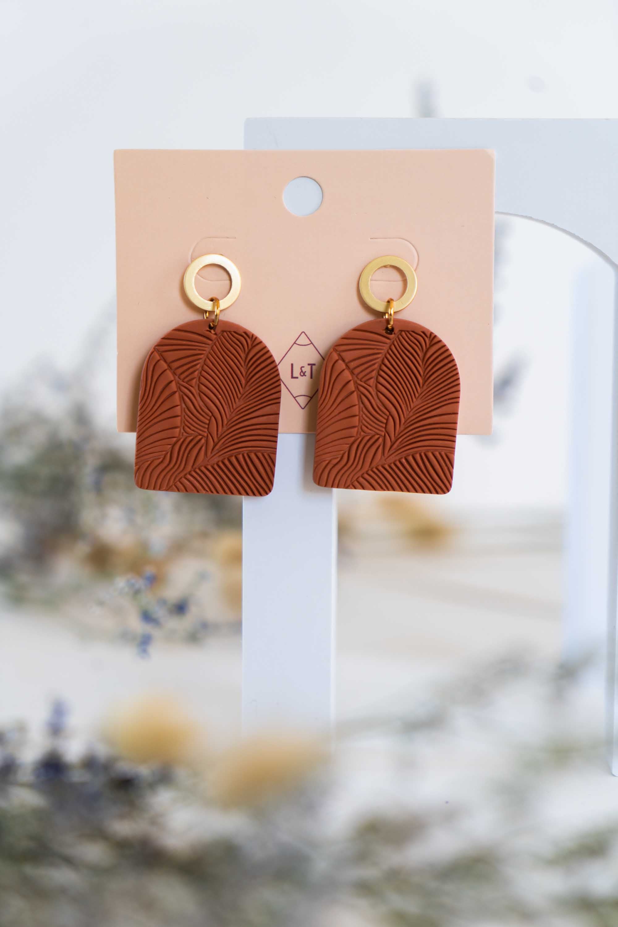 These clay earrings showcase a stamped leaf pattern and dangle gracefully from a small gold disc. Their natural, artistic design makes them a perfect accessory for casual wear, adding a touch of earthy elegance to any outfit.