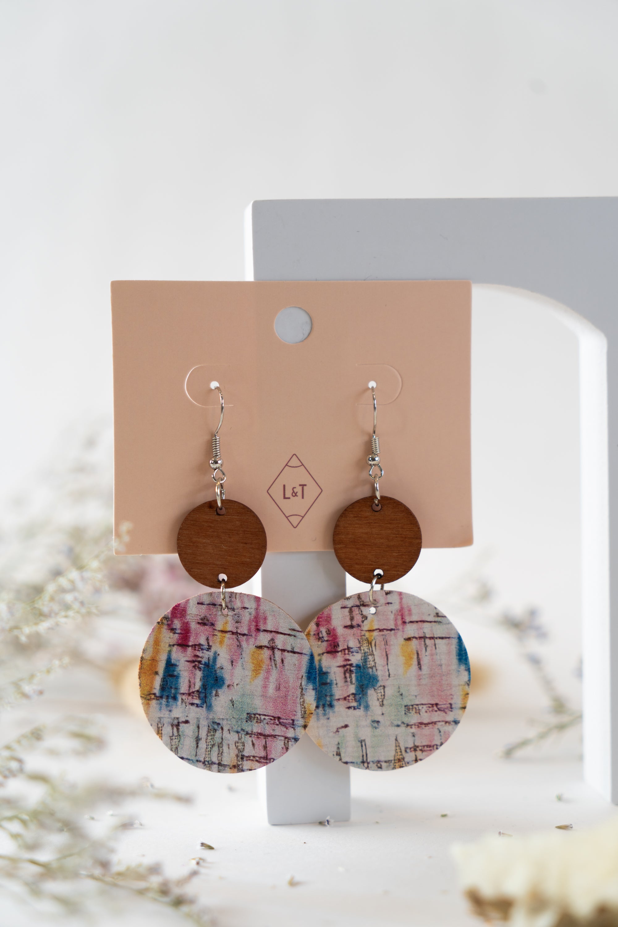 These earrings are cork textured with a soft toned multi colour splash effect, one of many patterned options available. Circular cork discs with a light wood detail at the top, they are both stylish and extremely lightweight to wear. Perfect for adding a unique touch to any outfit.