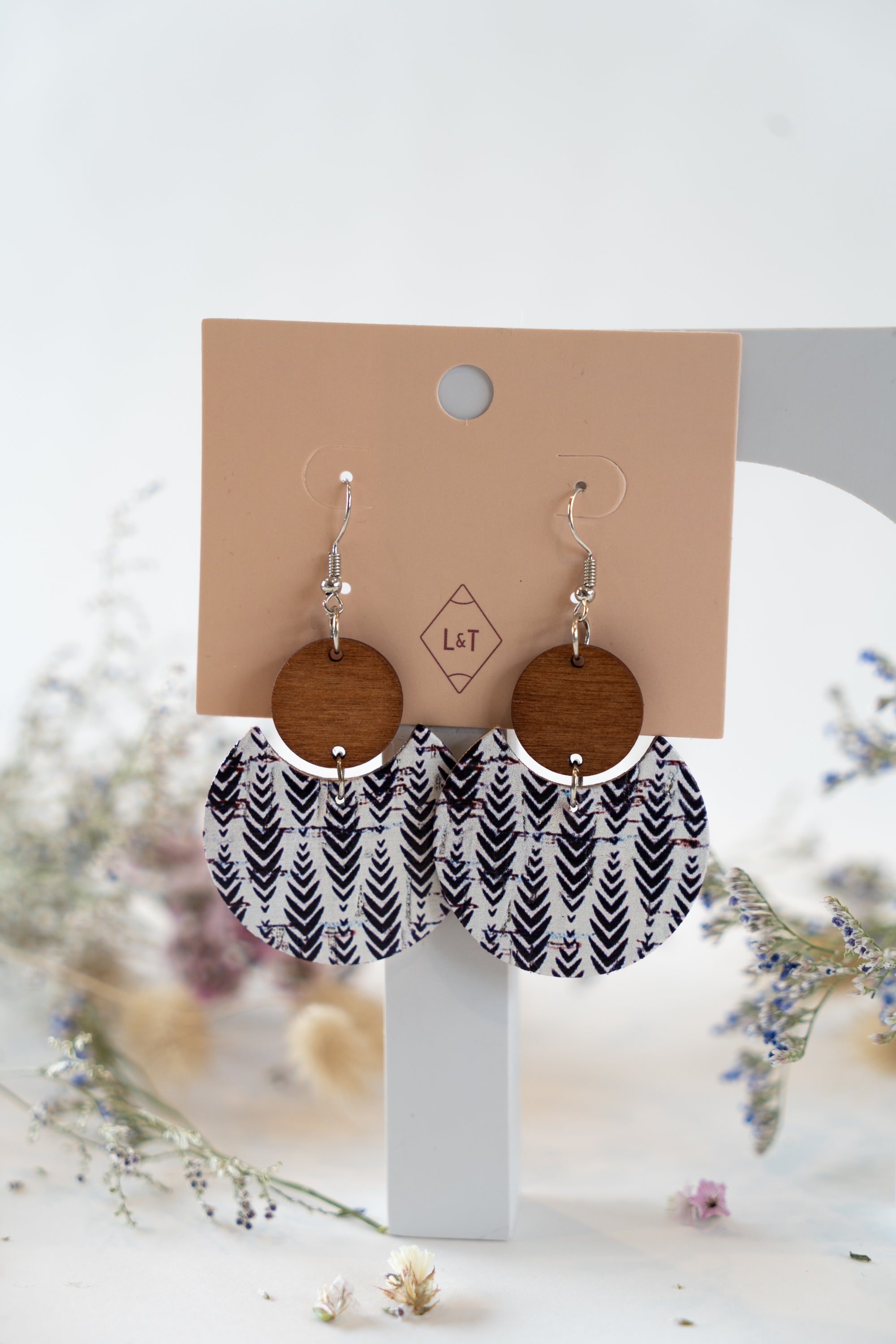 These earrings feature a crescent-shaped cork base in white with dash strokes of black, topped with lightweight wooden discs. The natural materials make them a lightweight versatile accessory, perfect for wearing anywhere from casual outings to more formal settings.