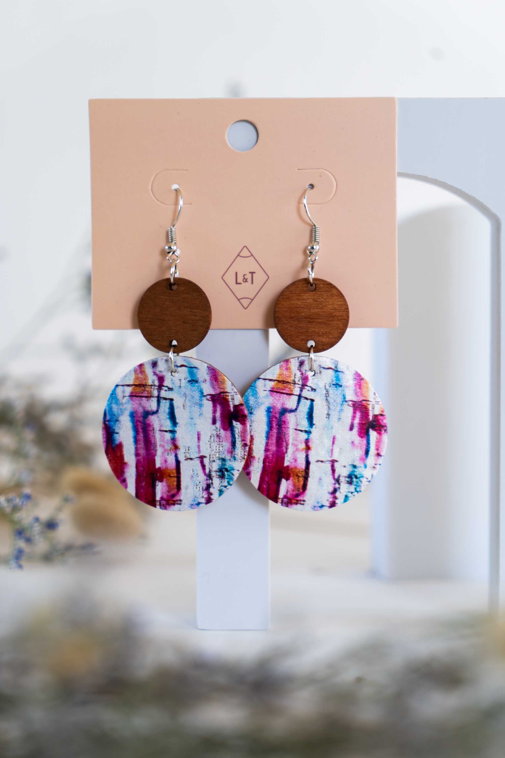 These earrings are cork textured with a multi colour splash effect, one of many patterned options available. Circular cork discs with a light wood detail at the top, they are both stylish and extremely lightweight to wear. Perfect for adding a unique touch to any outfit.
