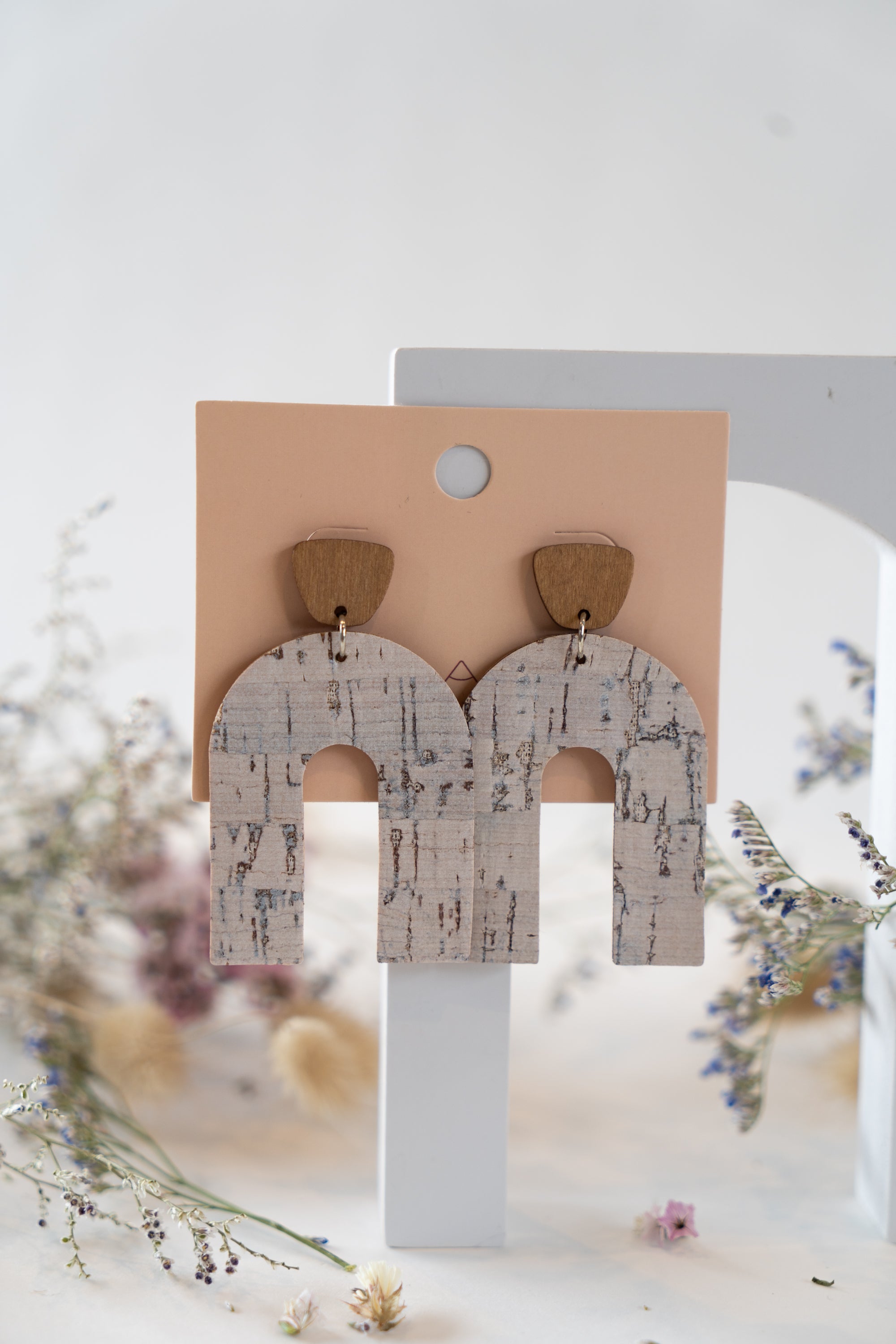 Cork textured earrings are a unique, lightweight accessory made from natural cork material and this pillar style option is in a textured finish that mimics concrete. This concrete color gives them a neutral, modern aesthetic, making them versatile pieces that can complement a variety of outfits. These earrings are perfect for those who appreciate sustainable fashion with a contemporary twist.