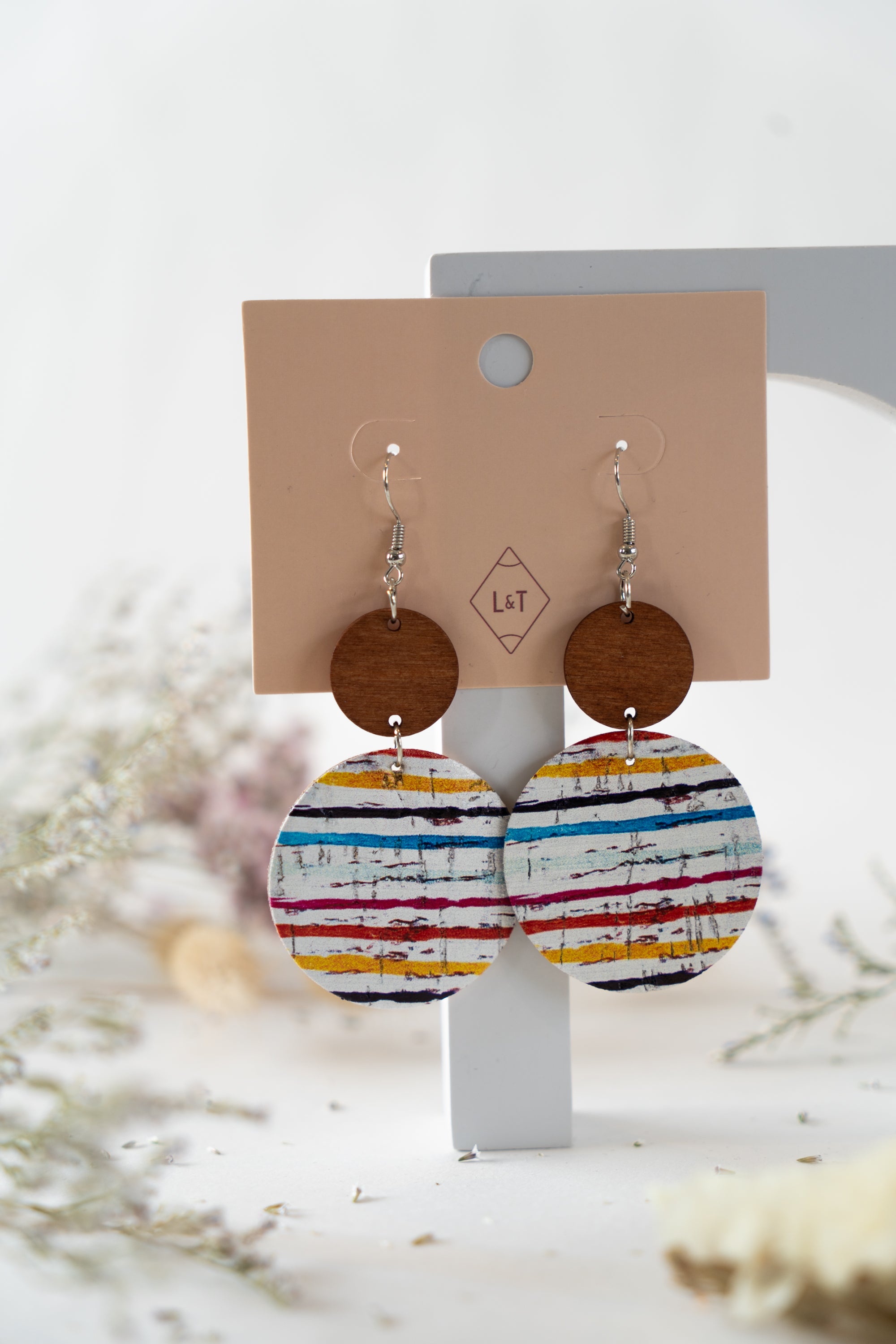 These earrings feature a cork circular base striped in a mix of black, blue, mint, red, and yellow colors on a white background. At the top held with a lightweight wooden disc. Their versatile color range makes them a perfect match for many items in your wardrobe.