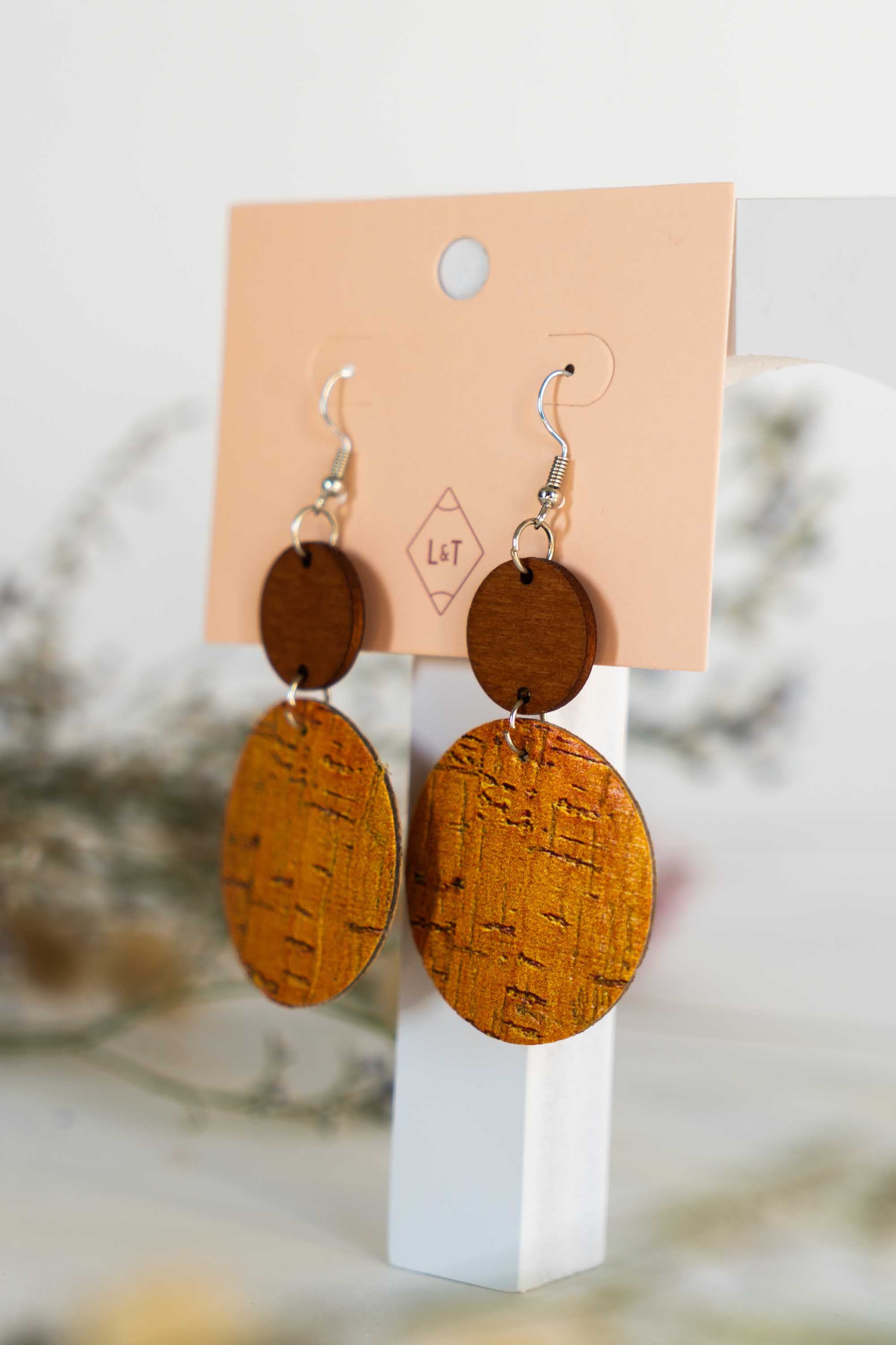 These textured cork earrings are available in two colorways. The top of the earring features a light wood detail, making them both stylish and extremely lightweight to wear. Perfect for adding a unique touch to any outfit.