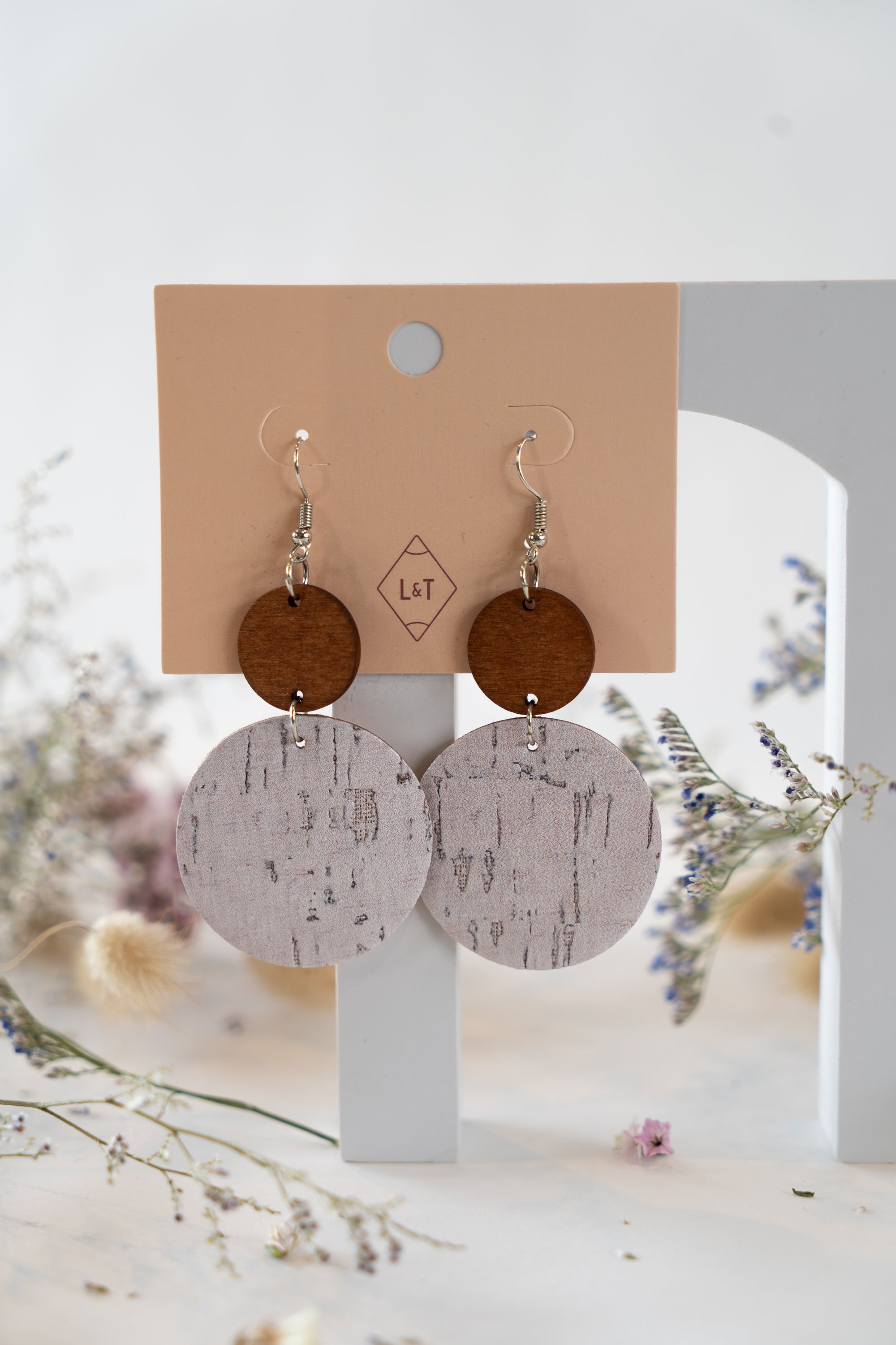 Cork textured earrings are a unique, lightweight accessory made from natural cork material and this circular style option is in a textured finish that mimics concrete. This concrete color gives them a neutral, modern aesthetic, making them versatile pieces that can complement a variety of outfits. These earrings are perfect for those who appreciate sustainable fashion with a contemporary twist.