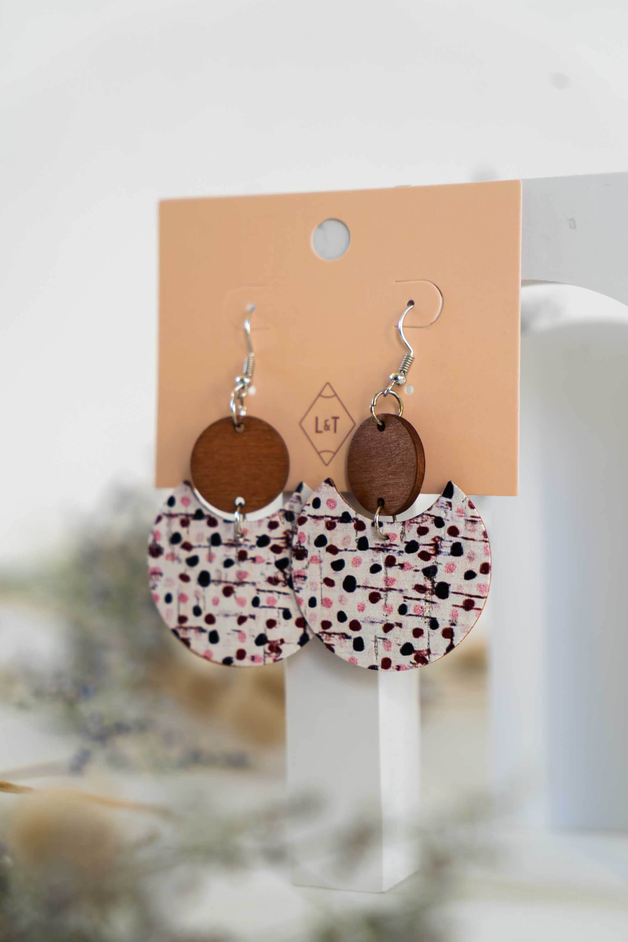 These earrings are cork textured with spots, one of many patterned options available. Crescent-shaped with a light wood detail at the top, they are both stylish and extremely lightweight to wear. Perfect for adding a unique touch to any outfit.