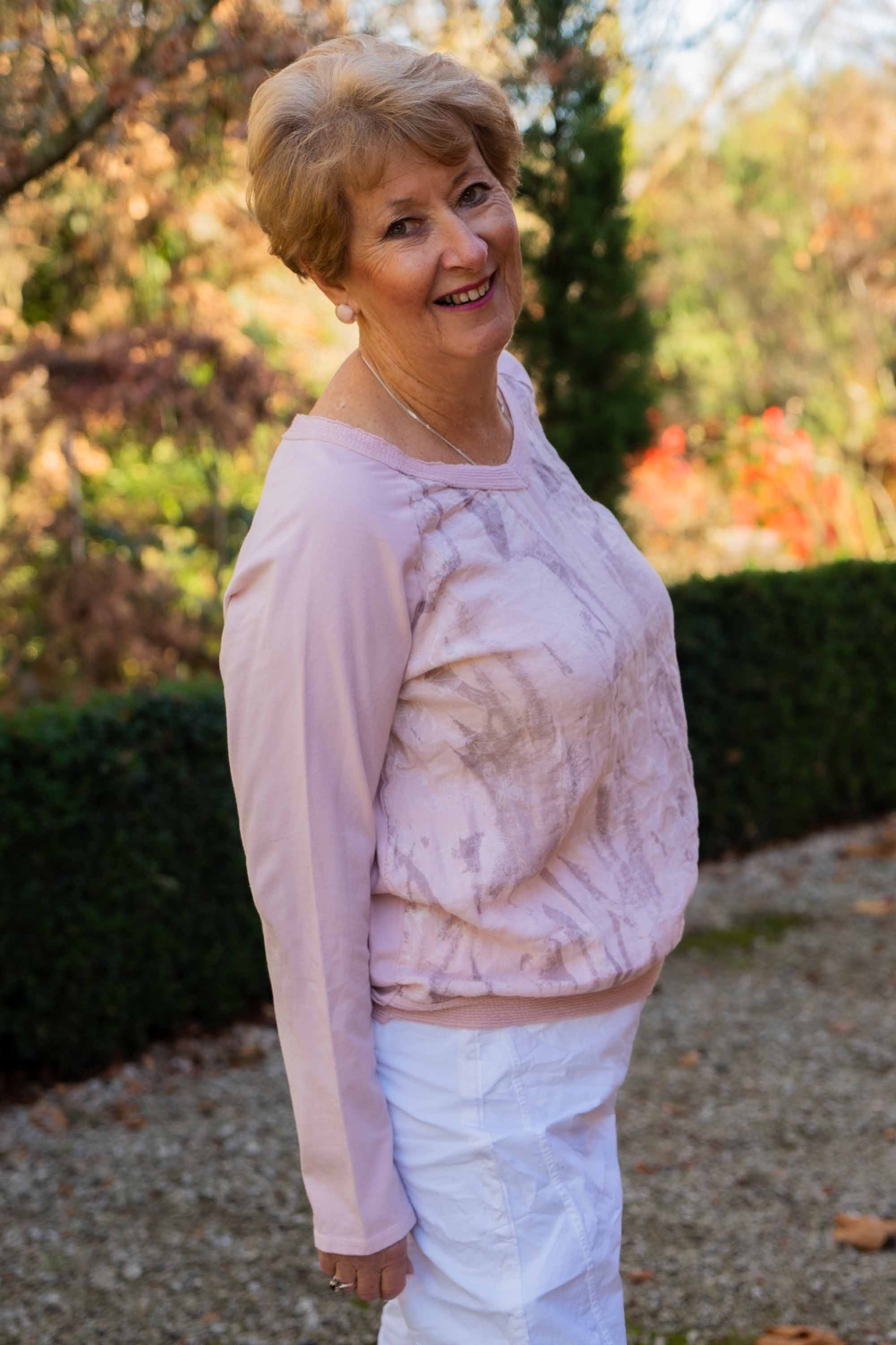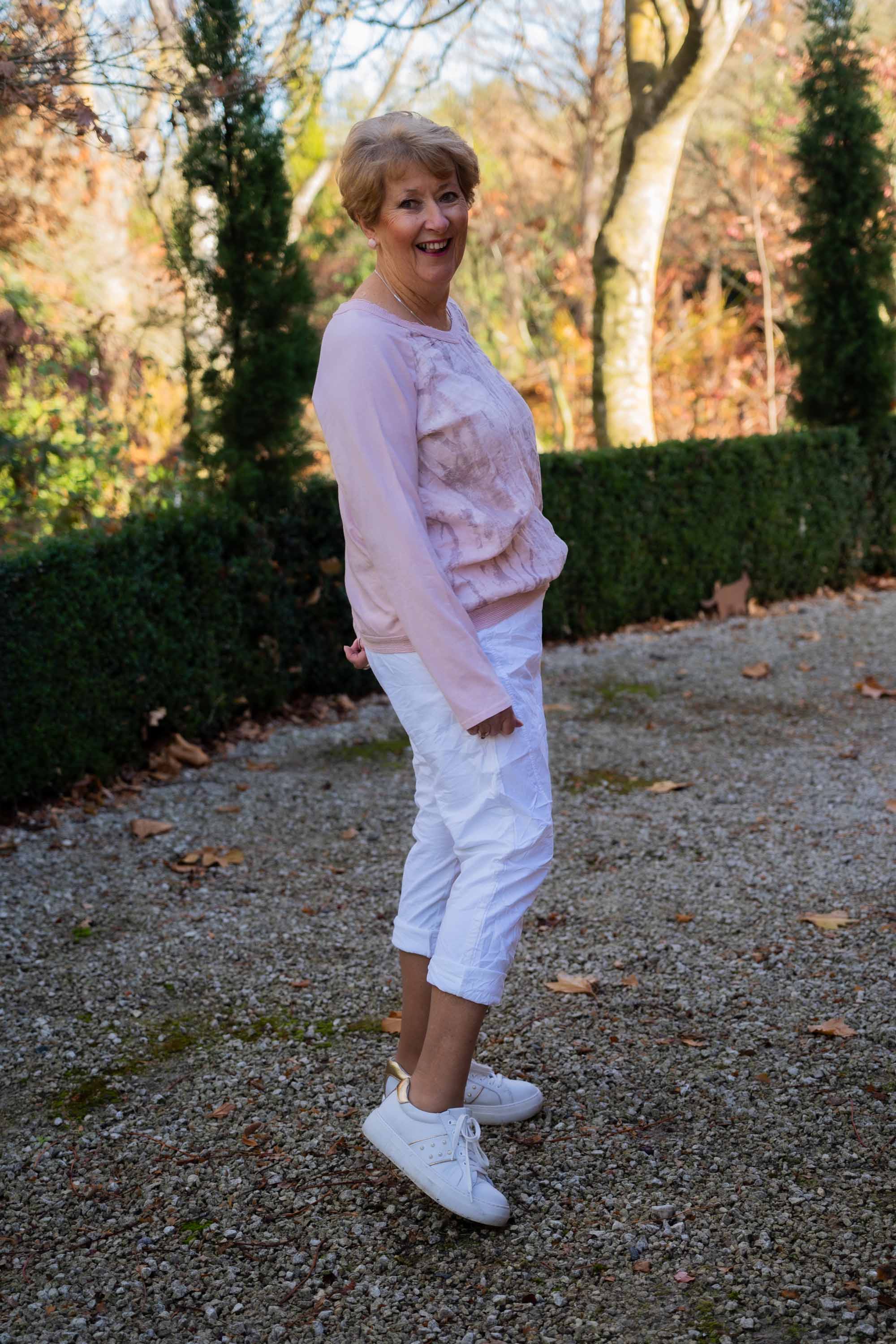 This sweat top is perfect for pairing with white or pastel pants, making it a versatile choice for casual outings or relaxed occasions. The V-neckline and band at the bottom is a soft stretch elastic in the same tone as the garment, which adds a flattering touch The lightweight construction makes it ideal for layering during transitional seasons. Embrace effortless style and comfort with this essential addition to your wardrobe.