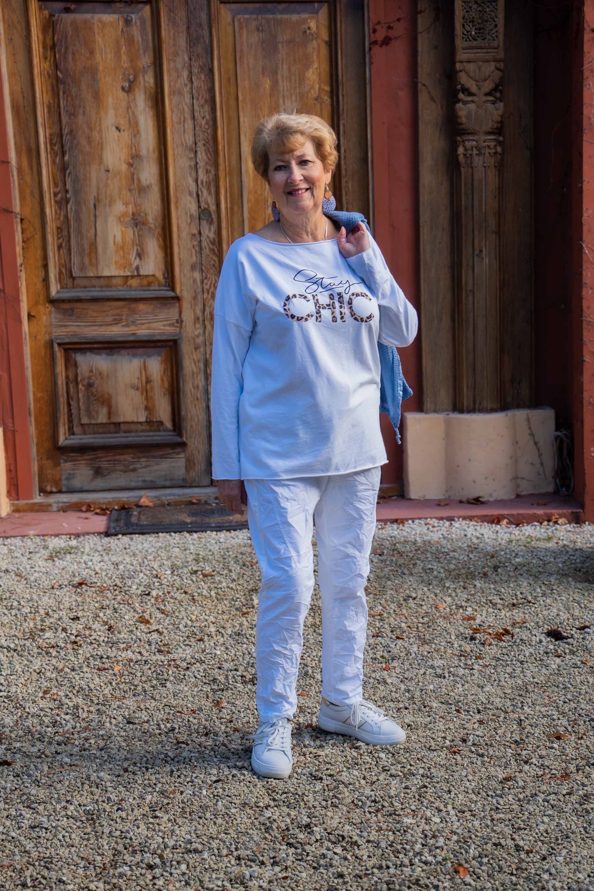 Introducing our 100% Cotton "Stay Chic" top, a must-have for your casual wardrobe. This comfortable piece pairs effortlessly with pants or jeans, offering a laid-back yet stylish option. It features relaxed drop sleeves and a rolled hemline, sleeve base, and neckline for a relaxed vibe. Adding a touch of personality, the front showcases "Stay Chic" in bold black lettering accented with a hint of animal print. Embrace comfort and style with this versatile top that promises to elevate your everyday look with ease.