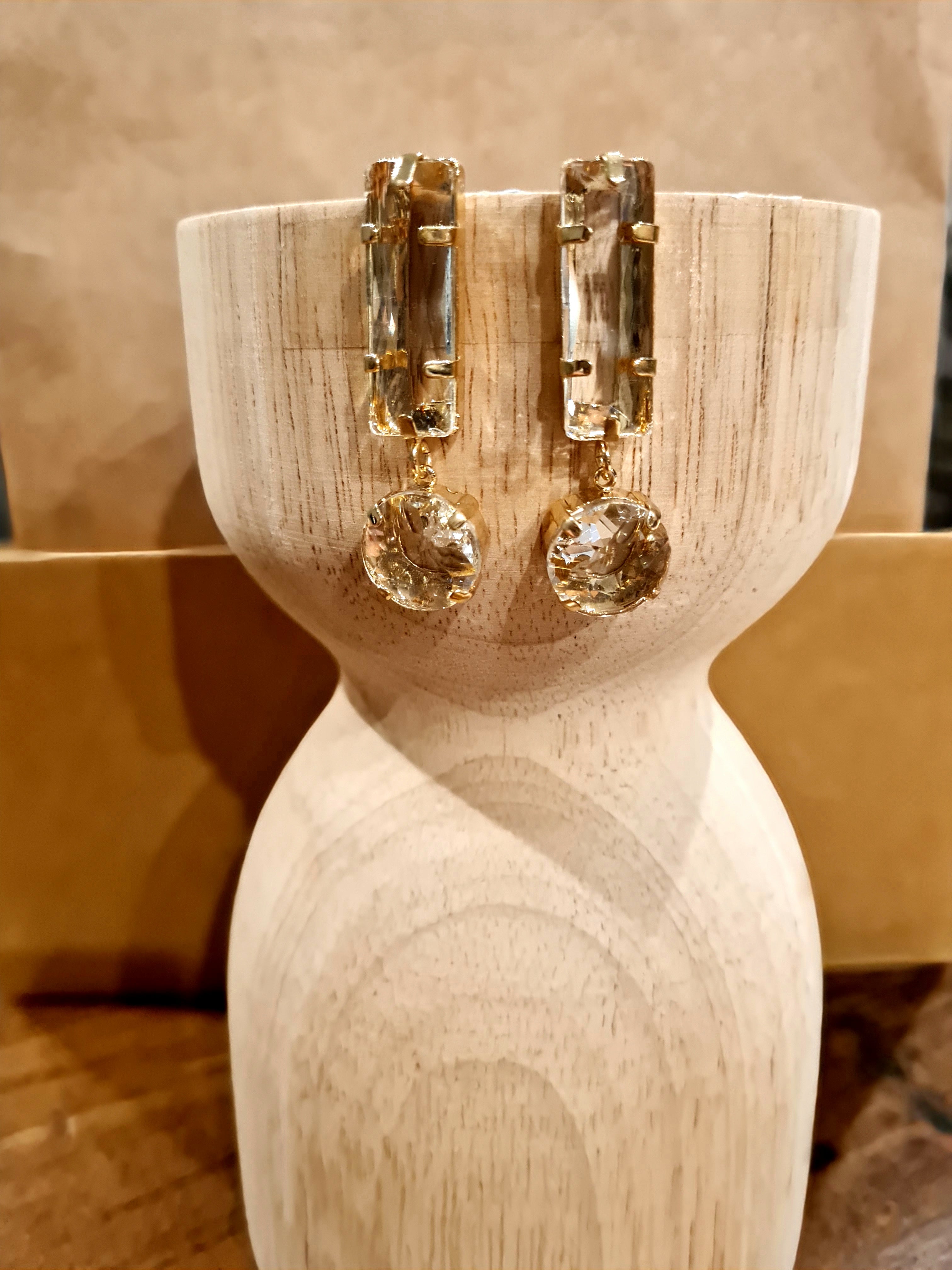 Bold yet graceful, these handmade earrings pair a sleek rectangular apricot crystal with a luminous round drop below. The subtle peachy tones catch the light beautifully, bringing softness to the strong, structured silhouette. A perfect fusion of modern and feminine, they’re ideal for making a subtle yet unforgettable statement.