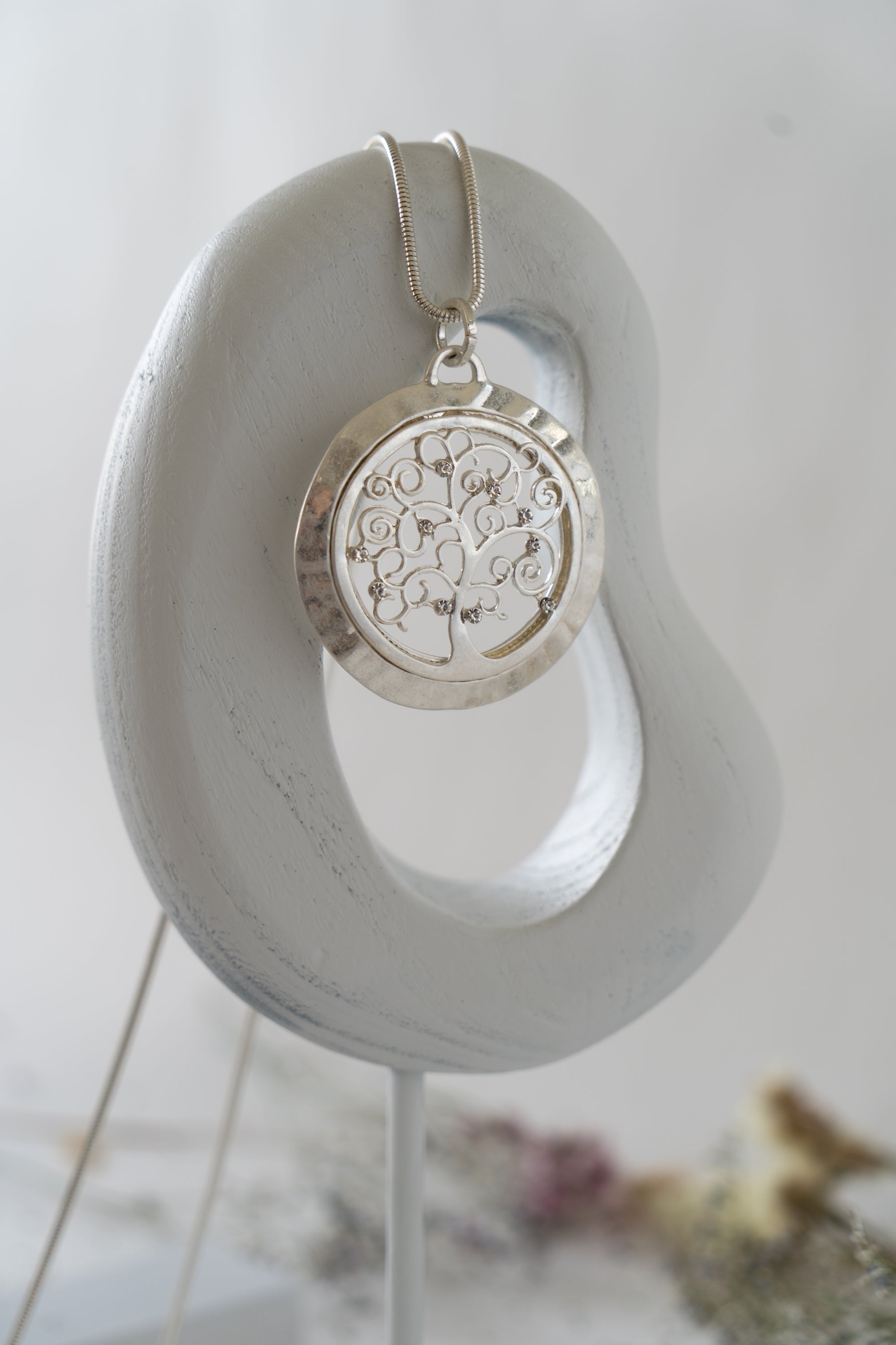 This popular piece is perfect for everyday wear, showcasing a circular disc with a "Tree of Life" design. The intricate tree motif is encrusted with sparkling crystals and framed by a polished silver border, creating a stunning and symbolic accessory. The disc hangs from a sleek silver chain, which can be adjusted with an extension of up to 7cm for a perfect fit. Its elegant design and versatile style make it a cherished addition to any jewelry collection. We have this in a few colour ways - currently in Rose Gold with Silver border or all in Brushed silver