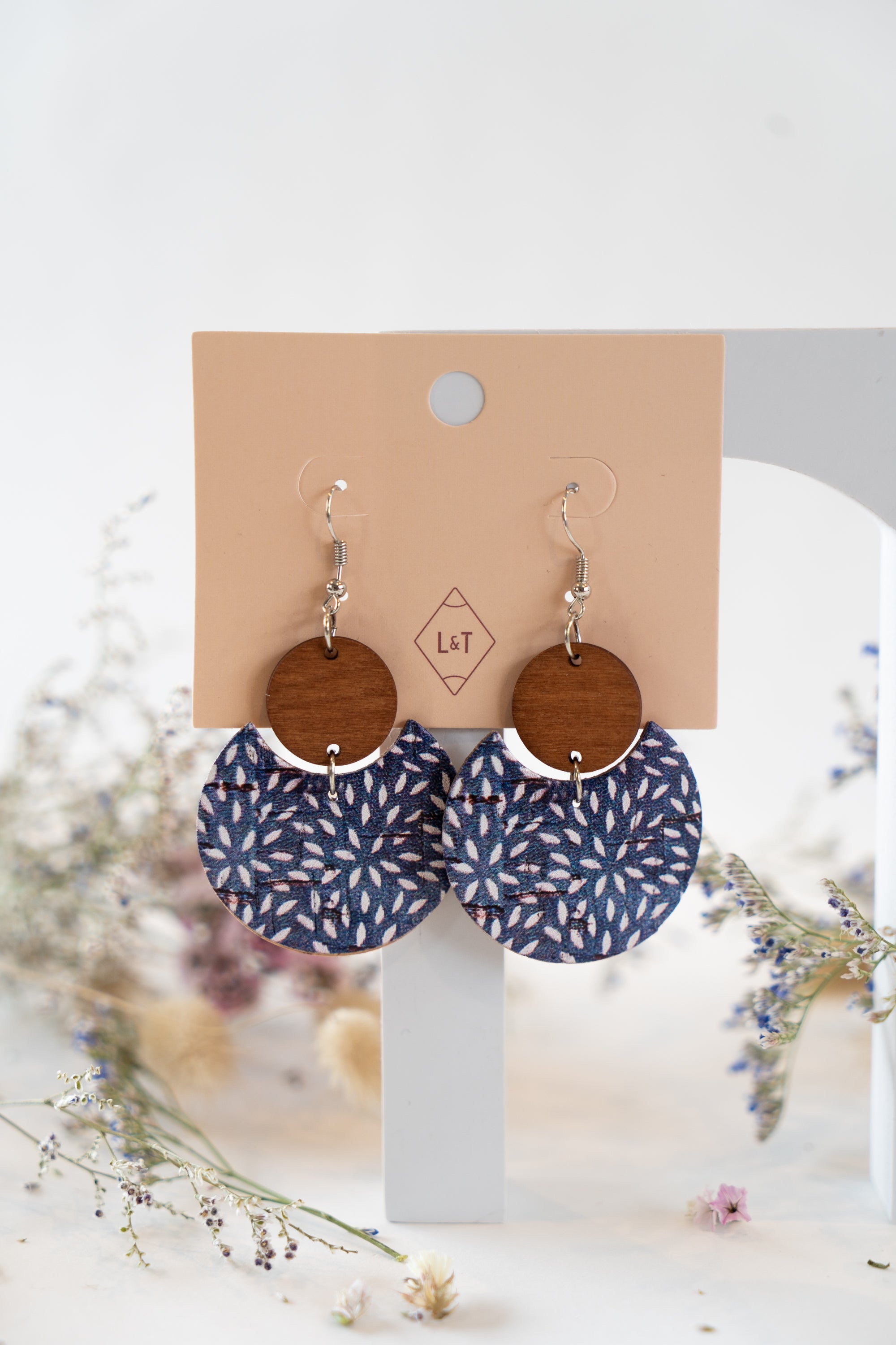 These earrings feature a crescent-shaped cork base in soft grey tones with dashes of white, topped with lightweight wooden discs. The natural materials make them a lightweight versatile accessory, perfect for wearing anywhere from casual outings to more formal settings. A second option is in blue tones with dashes of white on a textured base