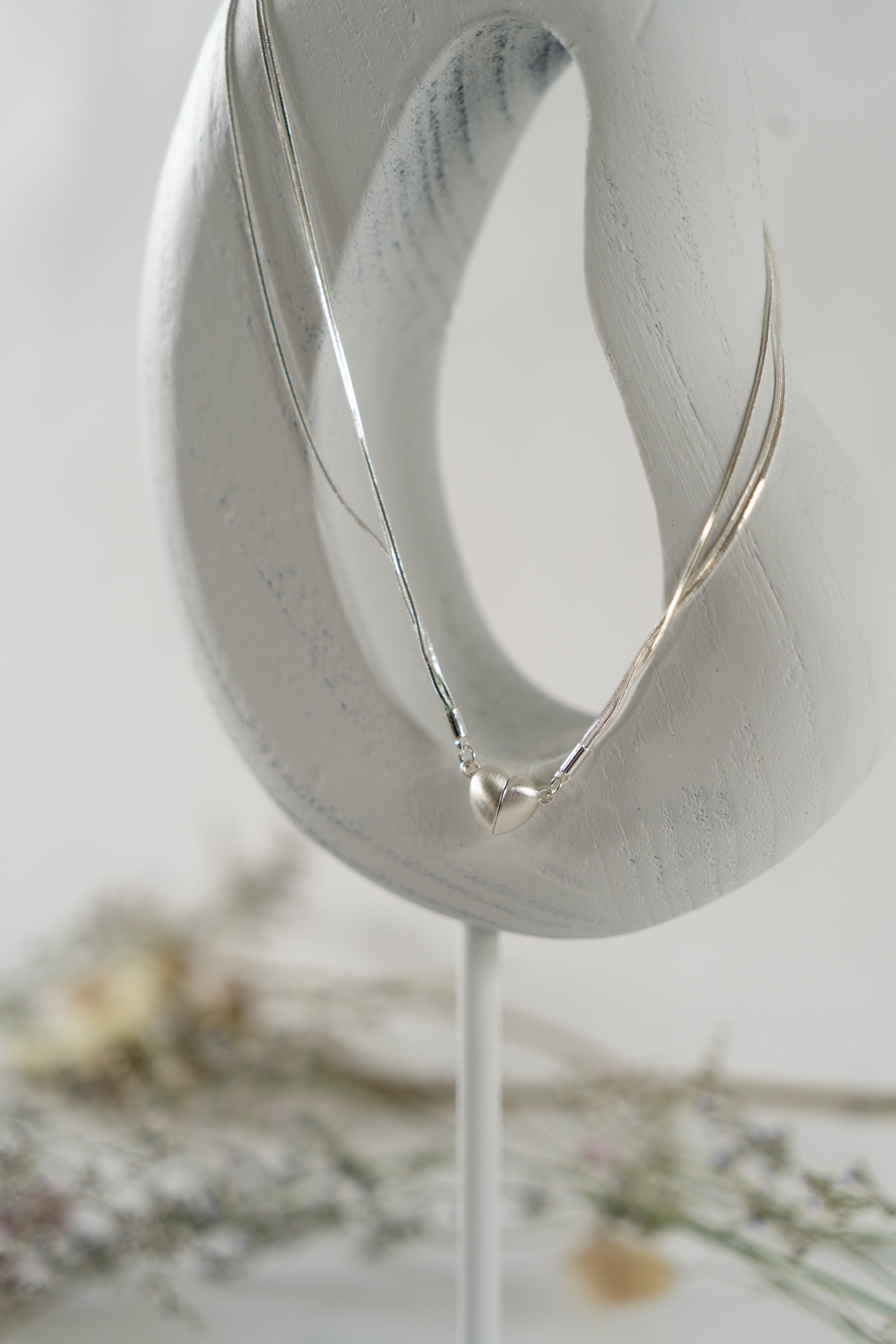 This delicate necklace features a triple silver chain with a two-piece heart that secures with a magnet closure. It's fine design makes it ideal for a petite person or as a thoughtful gift for a teenager.