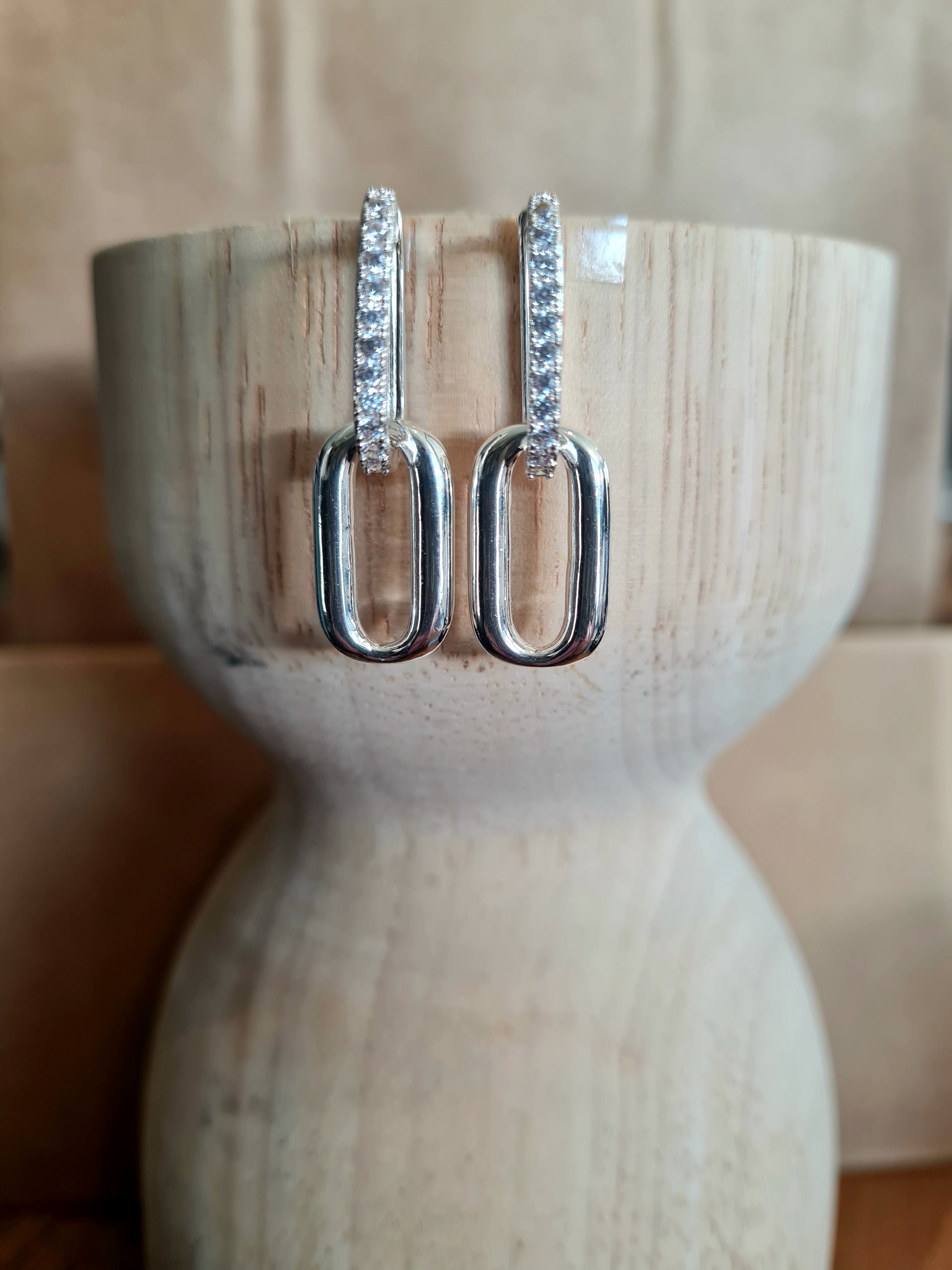 These elegant double rectangular hoop earrings in silver feature a modern stacked design. The top hoop is inlaid with sparkling crystals, adding a touch of refined glamour, while the plain silver bottom hoop keeps the look sleek and versatile. Perfect for both everyday wear and special occasions. If you wish you could wear the top hoops only as an evening option.