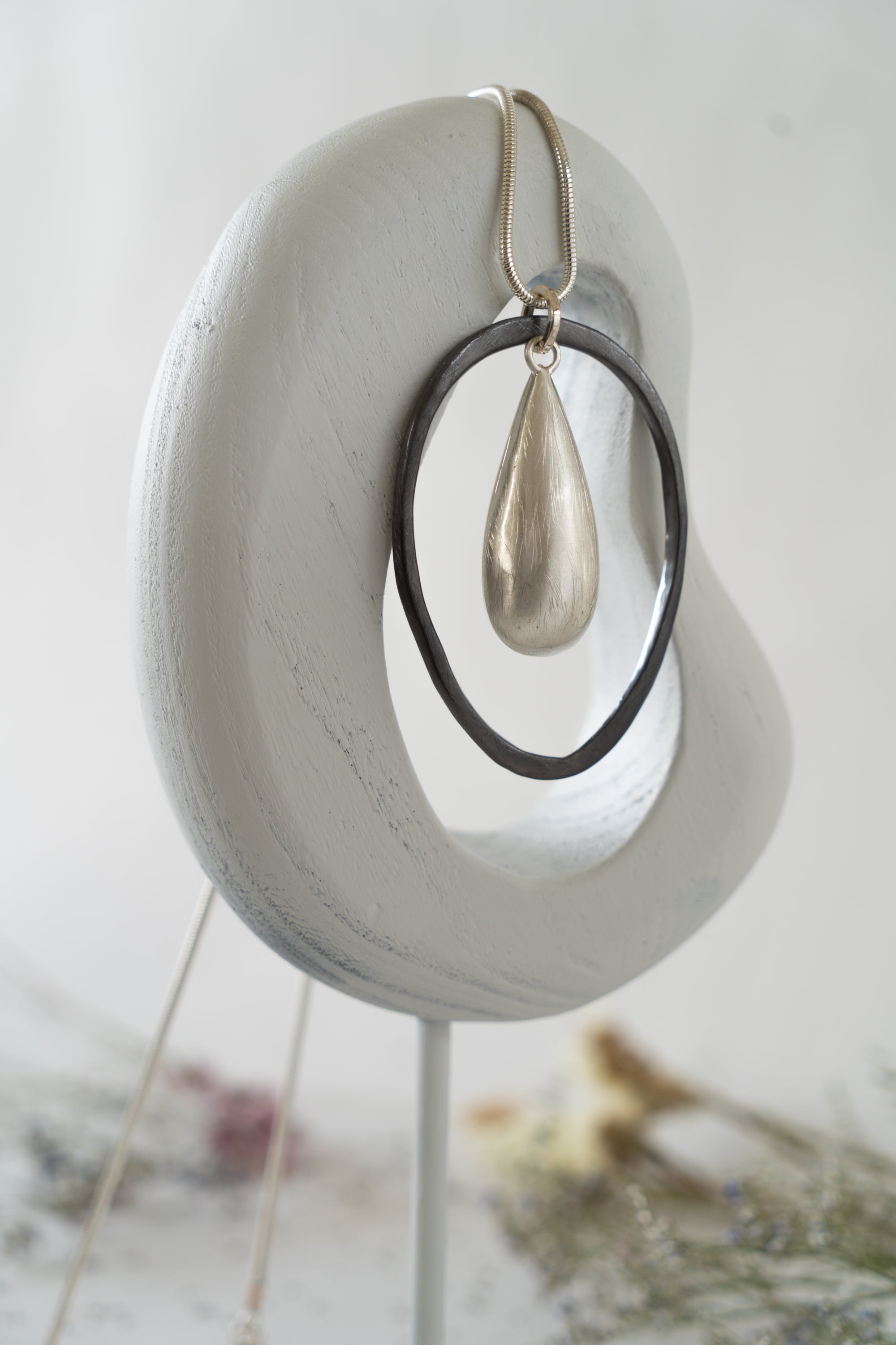 This piece exudes elegance with its simple yet stunning design. A large, brushed silver elongated droplet is the focal point, gracefully nestled within an elongated gray oval ring. Suspended from a sleek silver chain, this reasonably heavy piece makes a striking statement while maintaining a versatile appeal, perfect for complementing any outfit. The chain is also adjustable, allowing for an additional 7cm extension if needed, ensuring both style and comfort.
