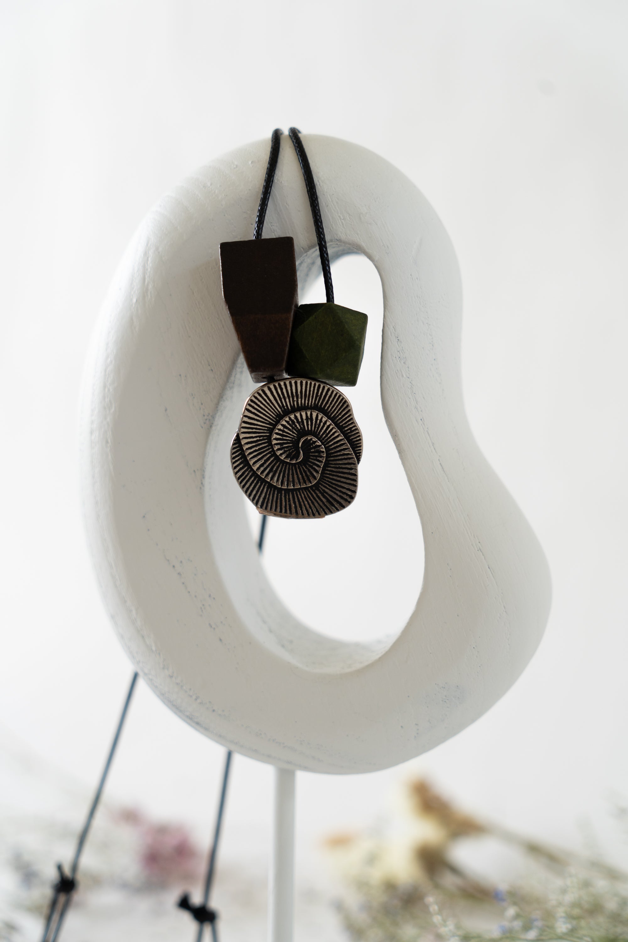 This necklace combines metal and wood for a unique, earthy design. It features an engraved swirling leaf dark metal plate at the bottom, held by hexagonal-shaped wooden beads—one large and one smaller, on a black cord. There are two options available: choose both beads in olive green for a uniform look or mix them with one brown and one olive green for a more varied, natural aesthetic. Measurement given at longest point and can be shortened if needed.