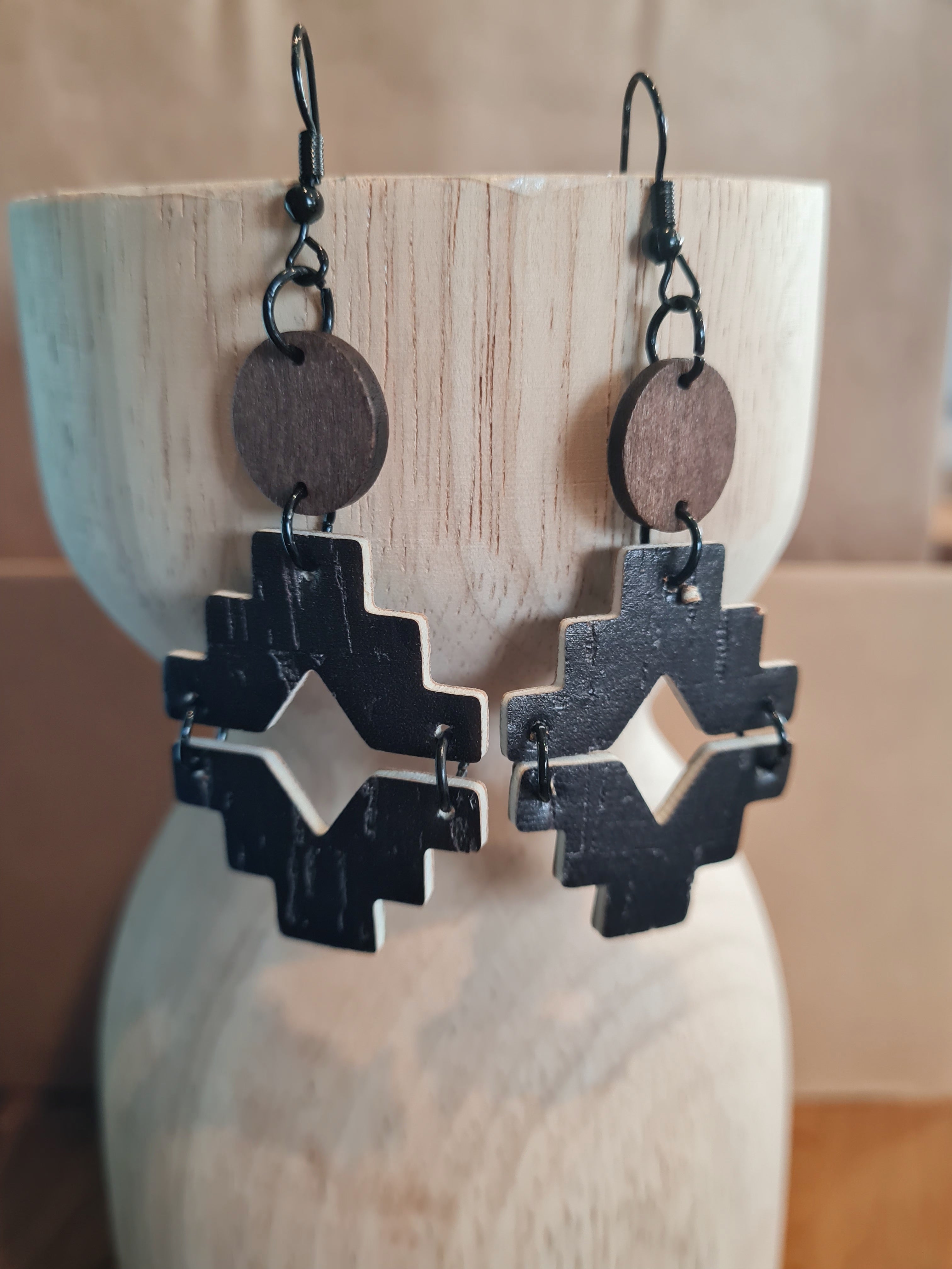 These bold wooden earrings feature a mirrored geometric design suspended from smooth discs, connected by striking rings that add depth and drama. Their layered construction creates fluid movement with every step, making them a standout accessory for those who love statement pieces with an earthy edge. Lightweight yet eye-catching, they bring both artistry and motion to your look.