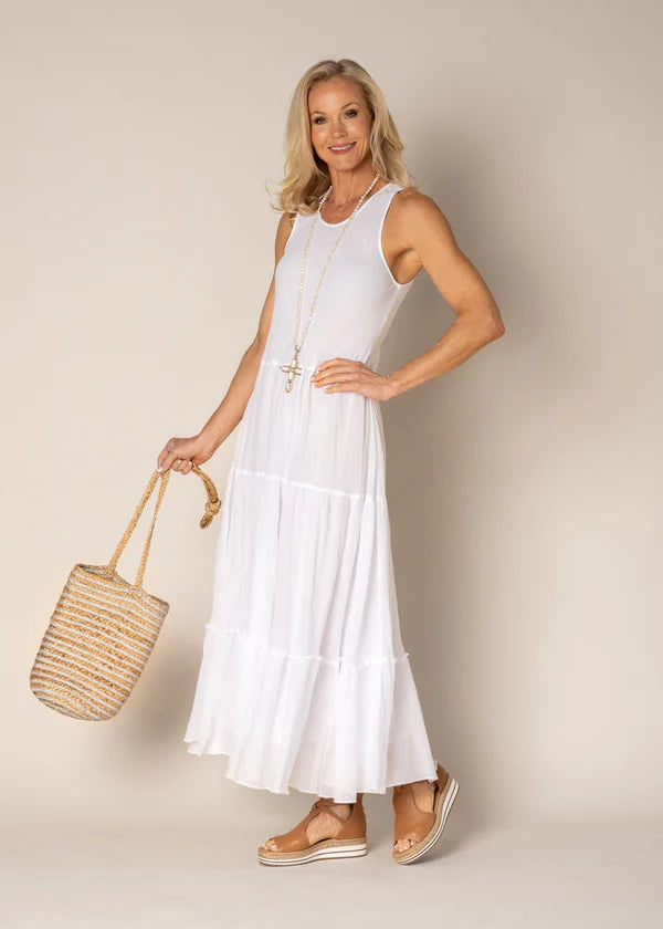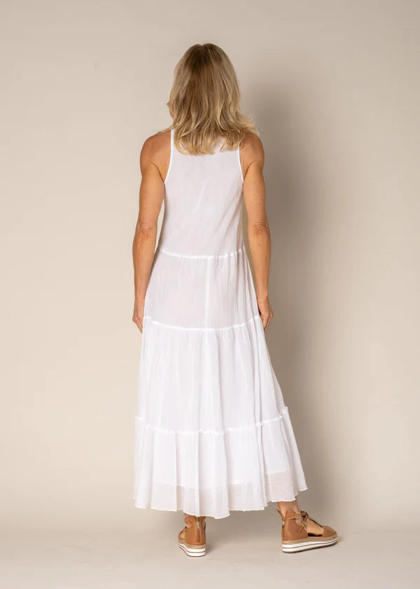 Delicate tiers cascade gracefully from the waist, further enhanced with a dainty small cotton frill that offers understated elegance. Its sleeveless design and round neckline create a classic outline that flatters a variety of body shapes. The crisp white hue not only feels fresh and summery but also provides the perfect canvas for accessorising.