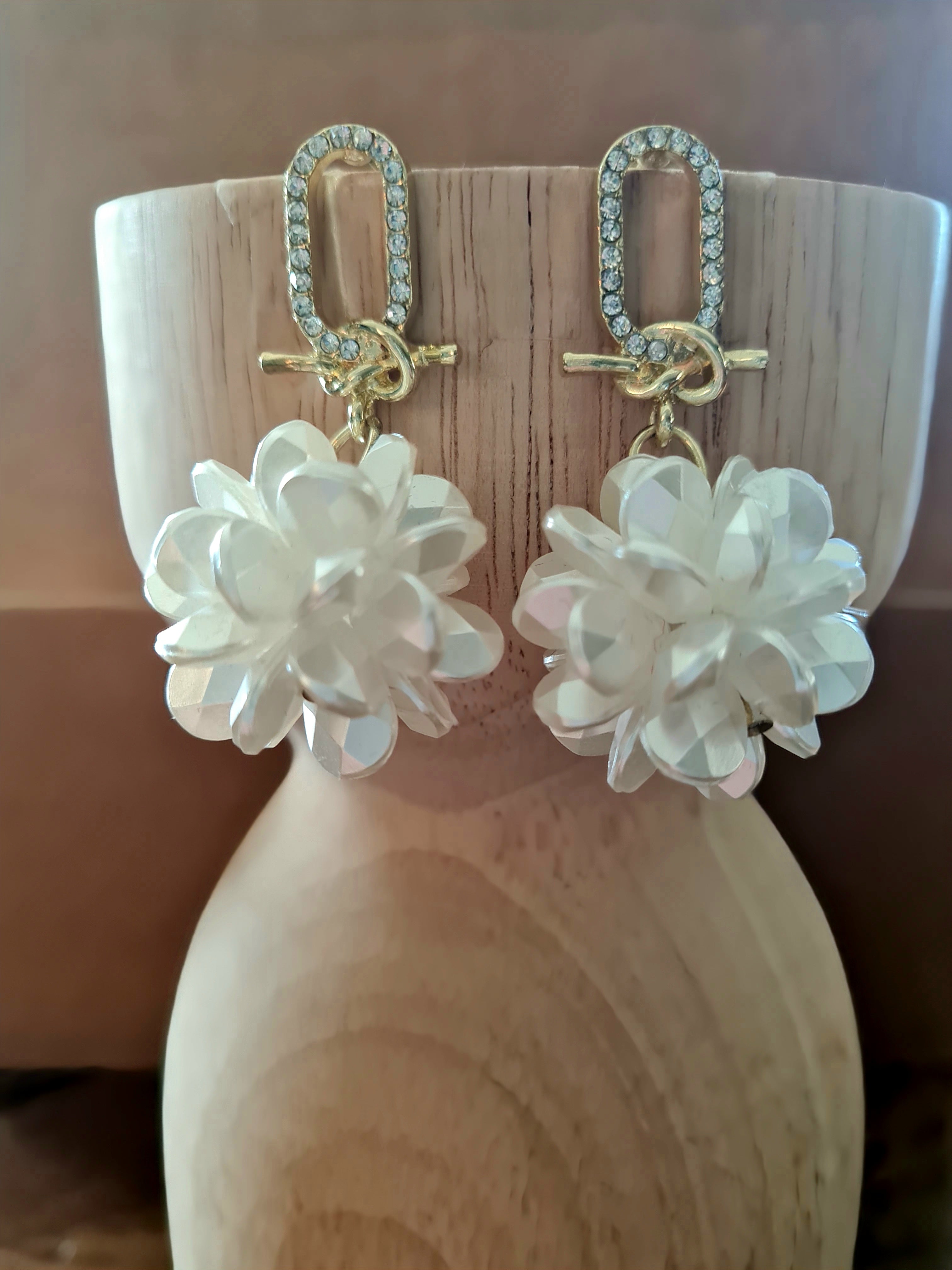 A statement of modern romance, these earrings feature a graceful, elongated knot design—crafted in sterling silver and finished with radiant gold plating—encasing shimmering crystals adorned. Suspended below, a beautifully sculpted, substantial acrylic flower blooms with soft elegance, creating a stunning contrast of texture and form. Elegant and eye-catching, this piece is the perfect finishing touch for a bride or anyone celebrating a special occasion with elevated style.