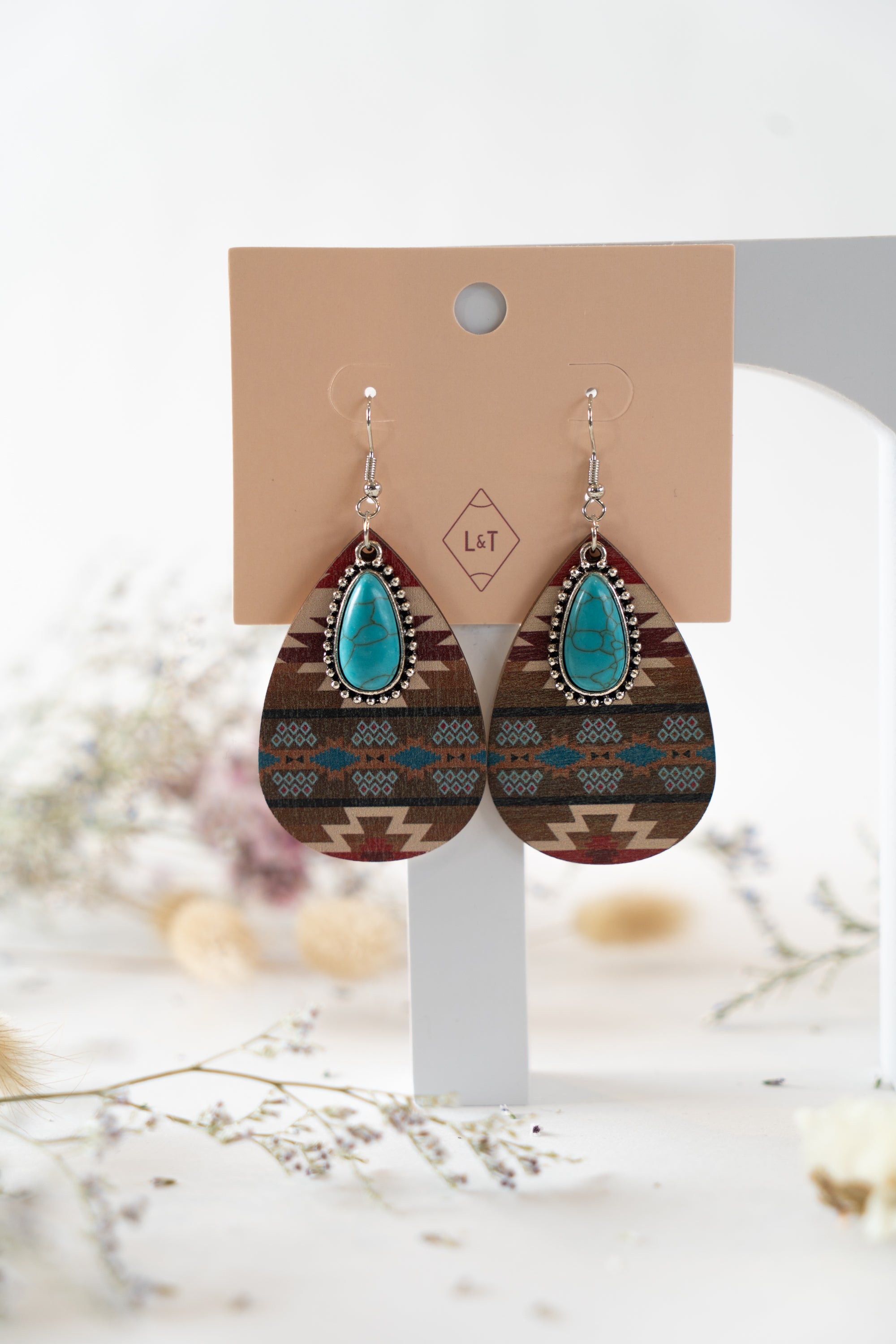 These earrings feature a lightweight wood base with a turquoise-colored stone set in silver on top, giving them a distinct Native American feel to them. Available in two colorways, they add a touch of exotic elegance to any outfit.