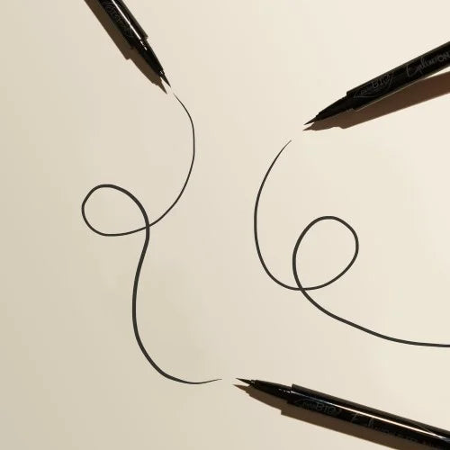 Thanks to its fine, flexible brush tip, the eyeliner is ideal for drawing precise lines and working in a controlled manner. Its mild formula with activated charcoal and organic cornflower is gentle on the skin and offers a buildable texture. The innovative brush tip consists of concentrically arranged, particularly fine bristles that have a pentagonal cross-section. This makes them retain liquid better than round bristles. In addition, a metal ball is located in the container that stores the liquid for mixing when shaking it before use. Shake well before each use. Start with a line at the center of the eyelid and draw outward. Connect the line to the inner corner of the eye. Fine strokes and double lines are easily executed.