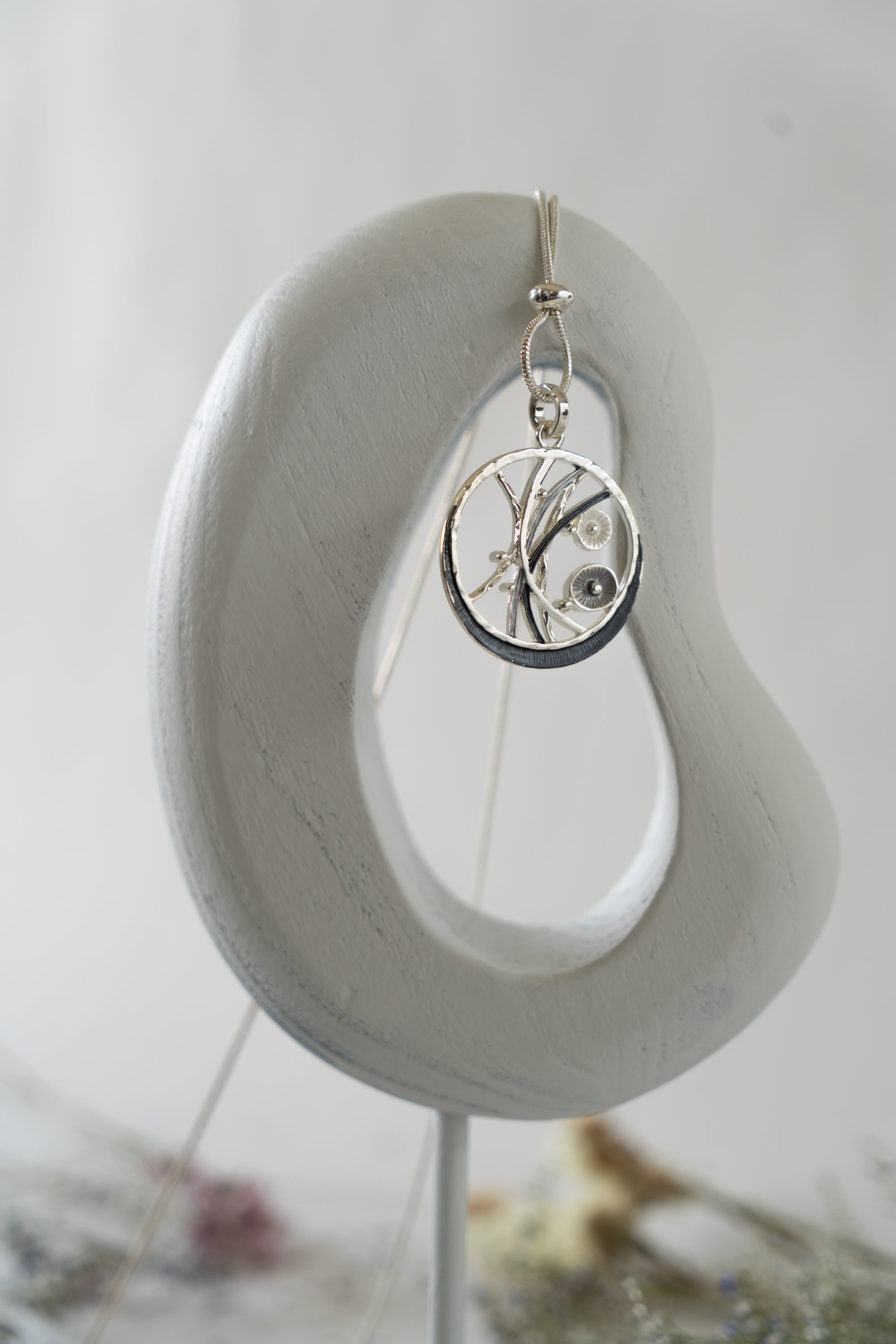 For a more subtle and refined look, these circular floral pieces are perfect. Available in two elegant color options - Taupe with Rose Gold or Grey with Silver - each disc is intricately detailed with delicate vines and flowers. The matching chains complement the discs beautifully and feature a sliding bead near the pendant, adding a touch of sophistication. Additionally, the chain is adjustable with a slider at the top, allowing for a customized fit that enhances its delicate charm.